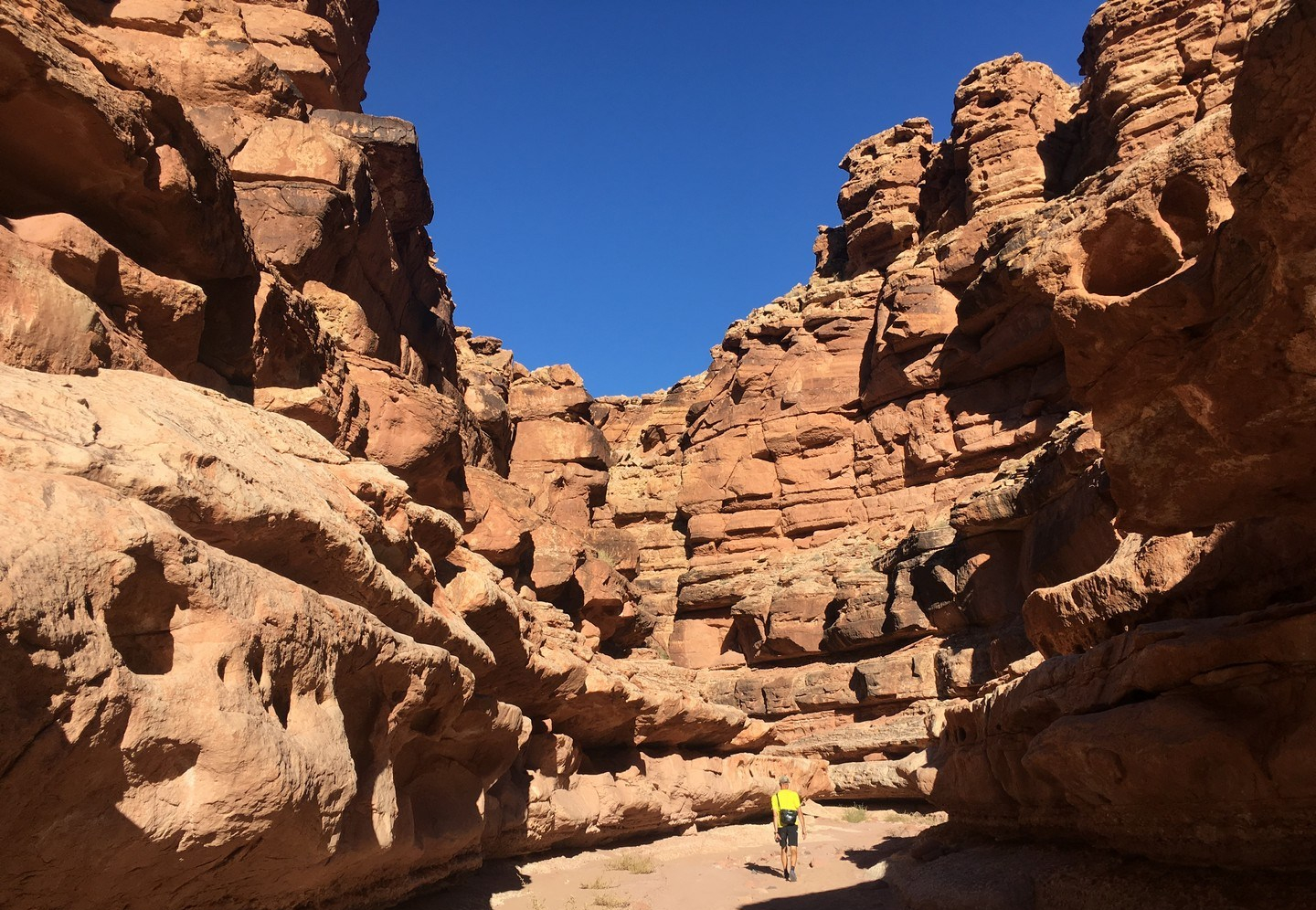 As the Colorado plateau mainly exist of sediment layers which have been pushed up, and the force of sudden rainfall will take sand and stones down to the Colorado river, the wash is a great place to see what the force of water does when carving out the canyon. We made it all the way to the Colorado river and back.