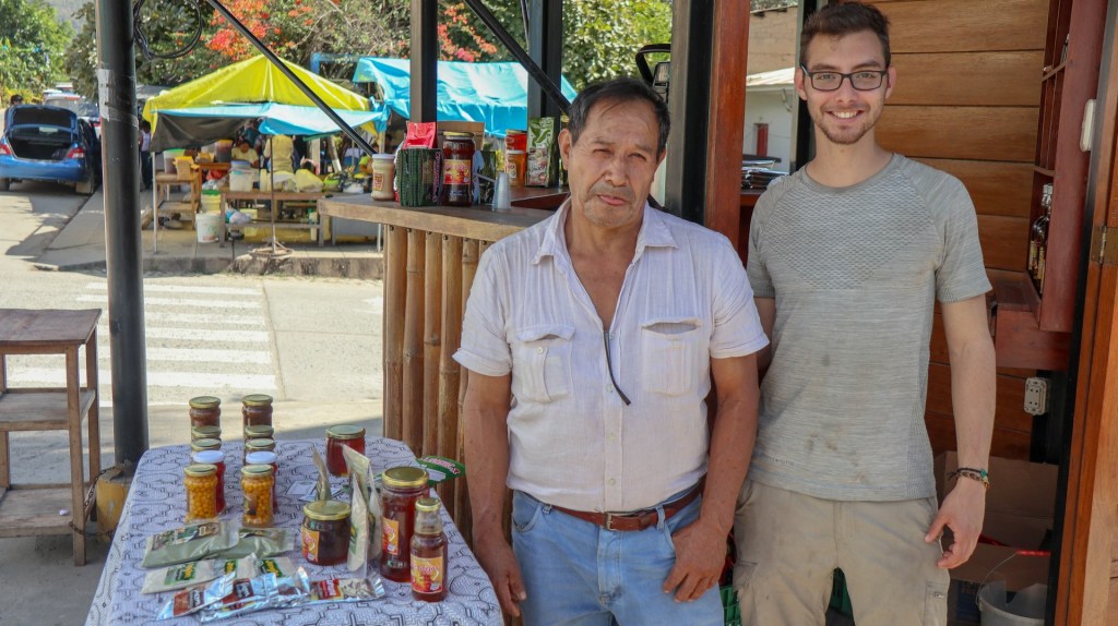 We are both not in a pushy mood so we decide to take a small dirt road detour to Encharati and call it a day at midday, the municipality of this area. People in suites and big avenues. We hope to find a spot to work online but spend the afternoon looking for the impossible. We do find some great chocolate and meet Oz from Israel who works as a volunteer in the finca of Mario. Awesome dark chocolate with chili and salt. Did we say we have passed endless plantations of cacao the past weeks?