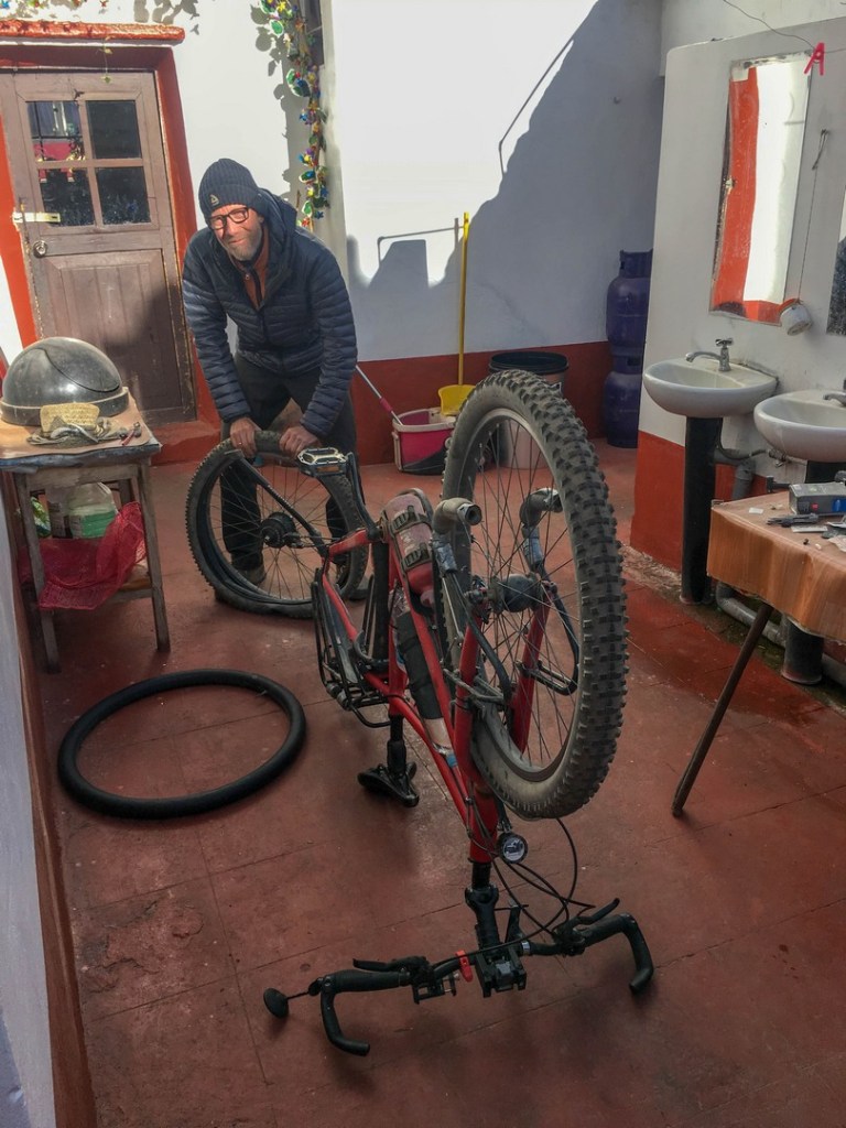 The first day on the altiplano where we would definitively have been able to bike the 85 km, as it is relatively flat, we need to sit in a car. But good we did, as even when I find some great take-a-way Frank can’t eat anything. At least he has a good bed and I find a solution to get him warm. Fill a bottle with hot water at the restaurant where I got the food and tuck it at his feet and lower back. Let’s say it was good we did not camp and that we had our own private bathroom. Fun detail, small bathroom where you first have the shower (shower curtain before the door) and then the toilet.