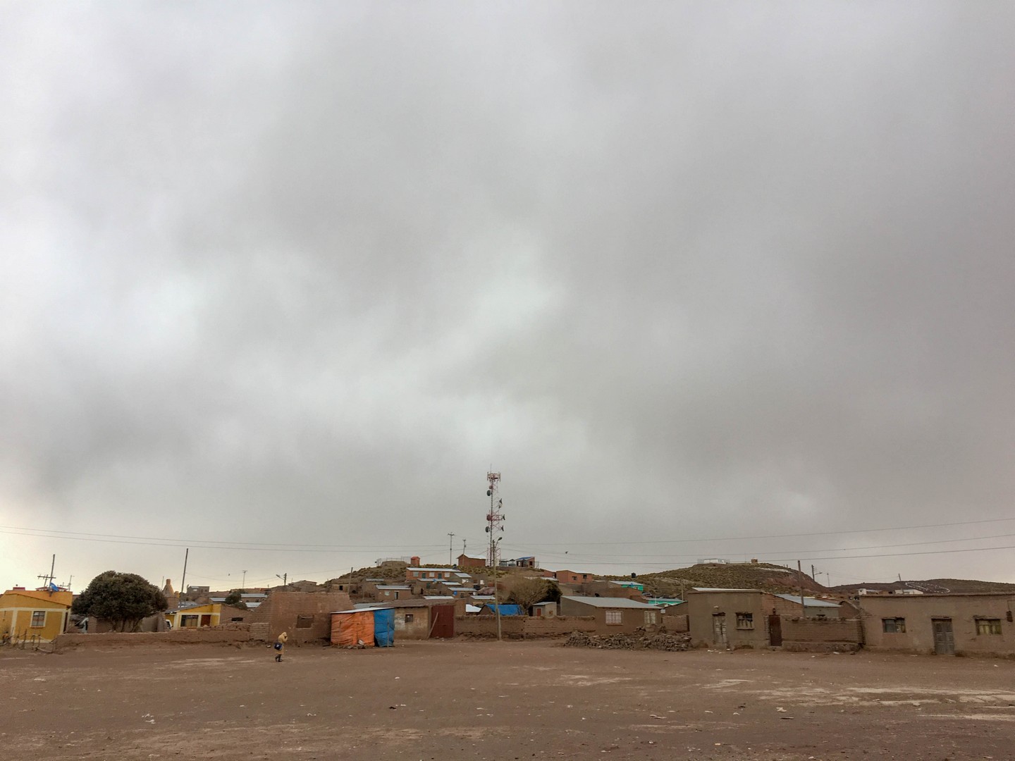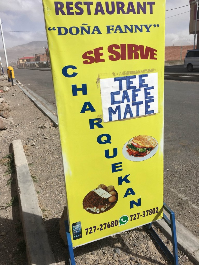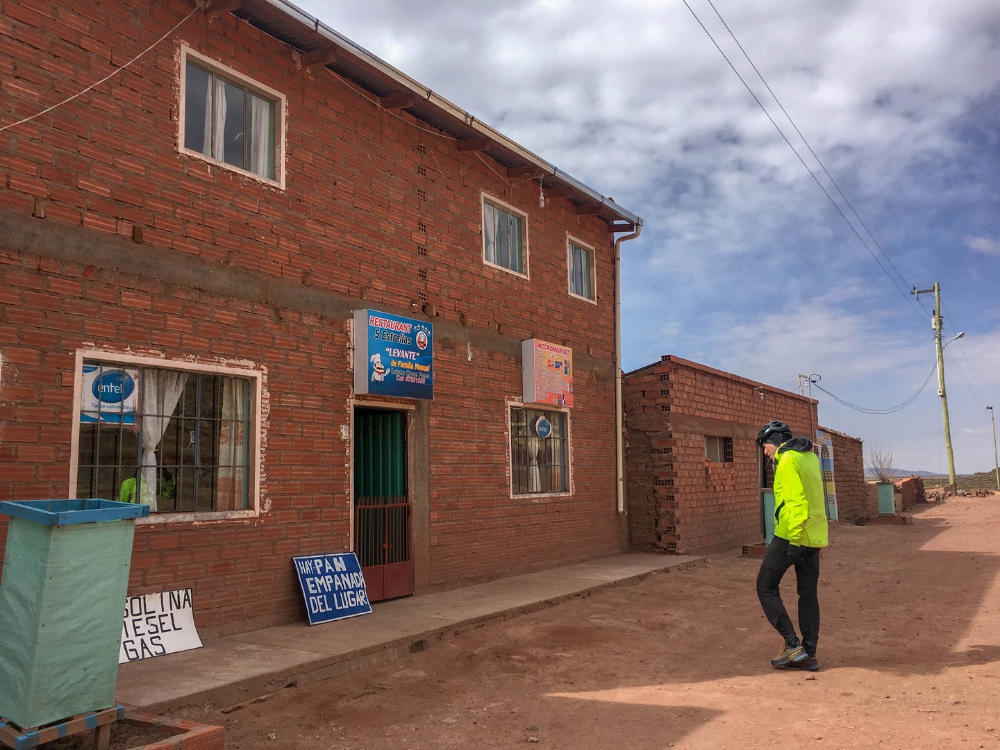After a meager 47 km but as it is already 15:00, we decide we need to have a look if the village of Toledo can offer us any shelter. We are both tired of the fierce headwind. Lucky us they opened a hostal only a few months ago. 4 walls and a matrimonial is all we need. No windows but at least shelter from the wind and the cold. We have time to walk through the village (the square), chat a bit with people, find some cheese and bread for tomorrow and eat street food: lama with baked potatoes. Not bad. An old lady tries to teach us Quechua, but a big quantity of coca leaves in her mouth and her limited command of Spanish make it hard to understand her. People in Bolivia are more closed than in Peru but once you start a conversation they are very open and welcoming.