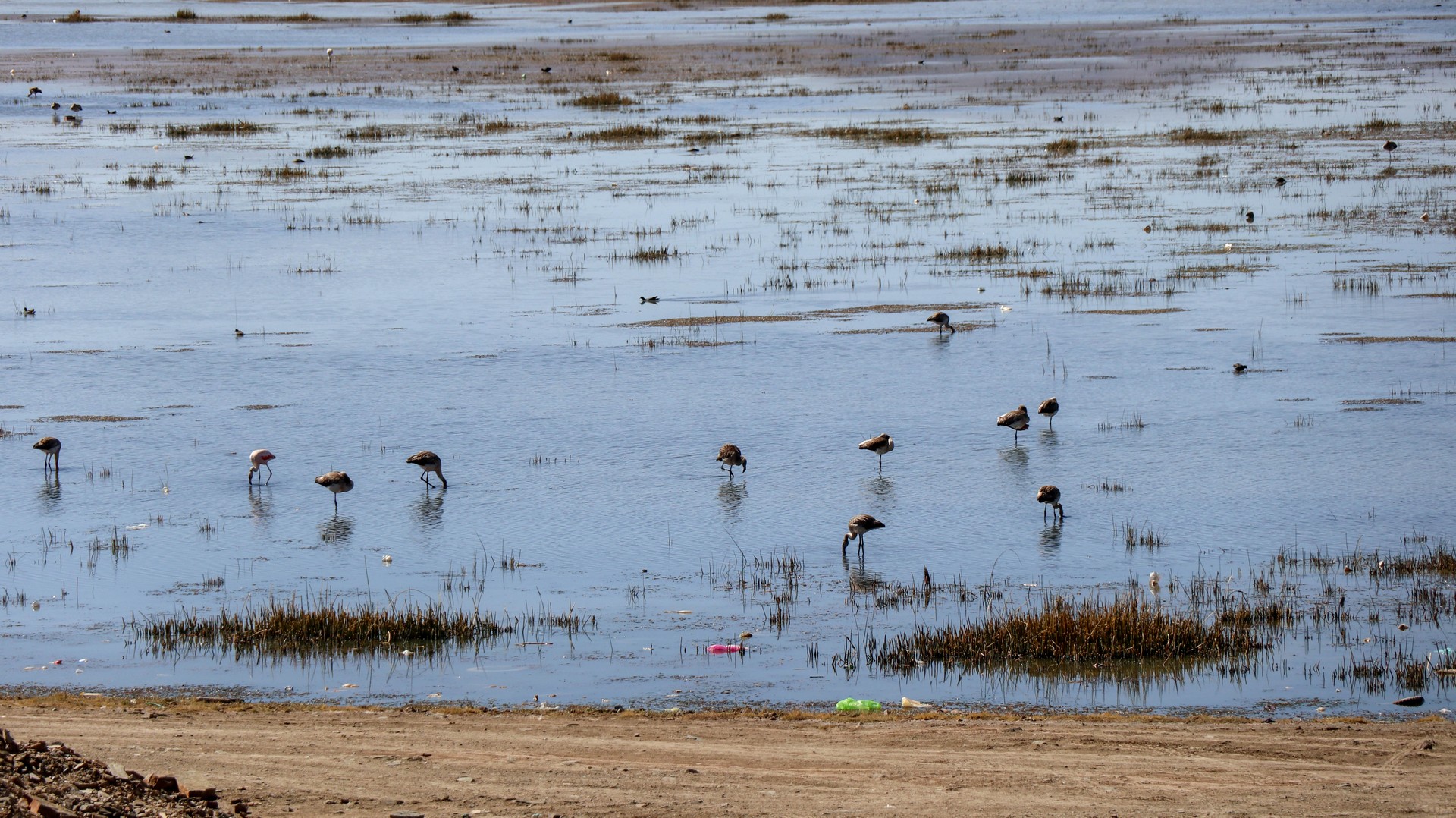 Passing a beautiful lake with flamingos brings us to the real altiplano. Flat on +3,700 meters. Almost no vegetation. Yellows and reds which compete to catch your eye. At a real small village we stop to have the street food. Chicken soup with a bit of rice and a small piece of chicken. A bit further down the straight road we stop again to eat our bread.