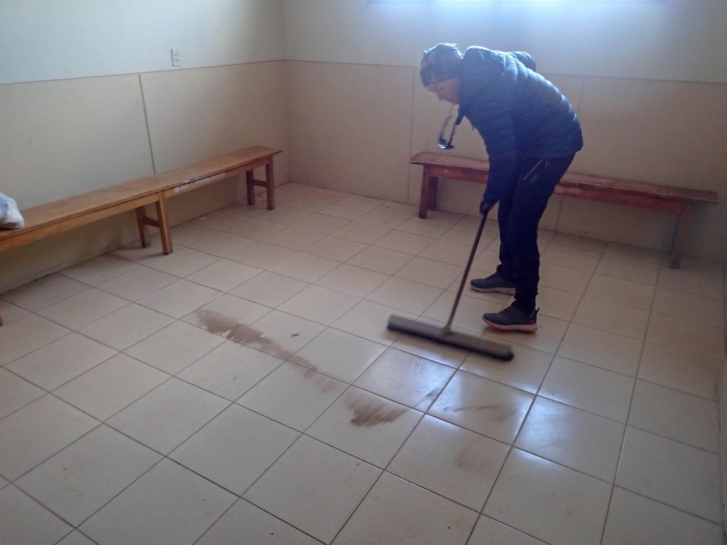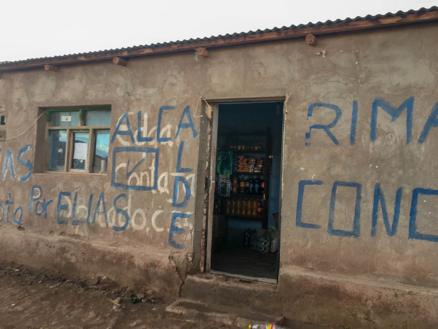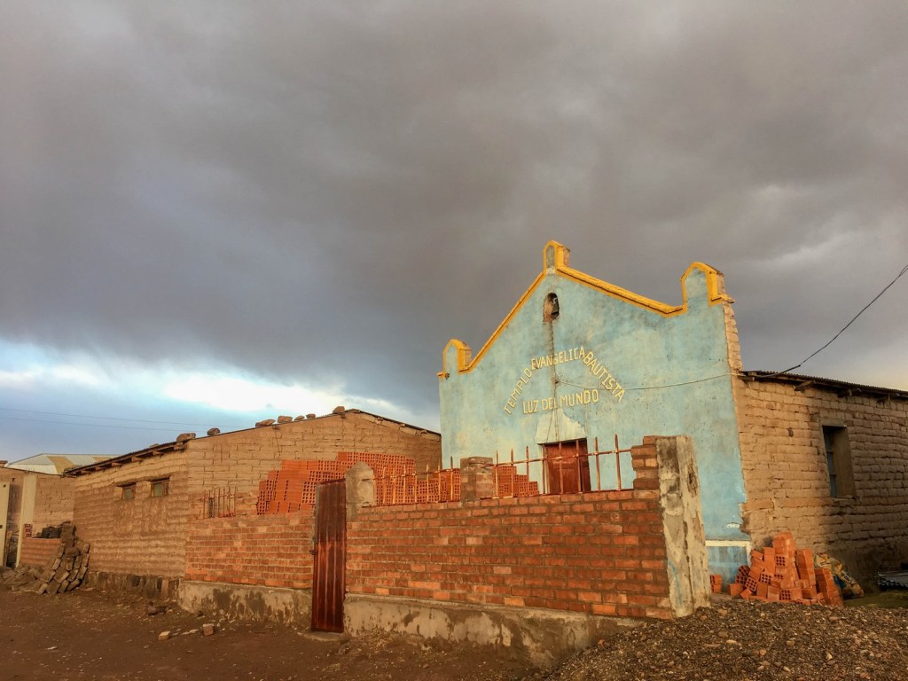 We ask at the health center if there is a hostal and when they say there is none, we ask if we can sleep at the construction site of the health center. They refuse but direct us to the “main square”, to ask at the church. The church is small and closed but we see the only fancy building in the village, a community hall (sports hall) and try our luck.