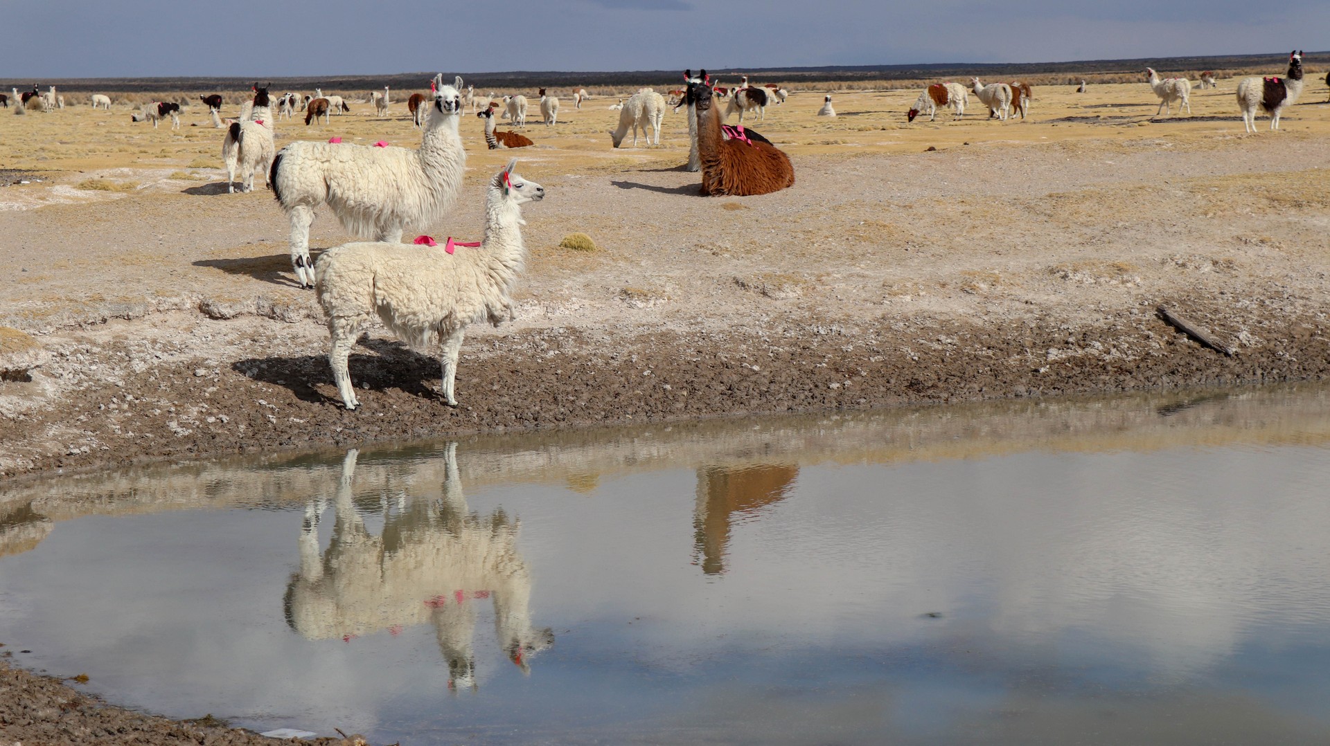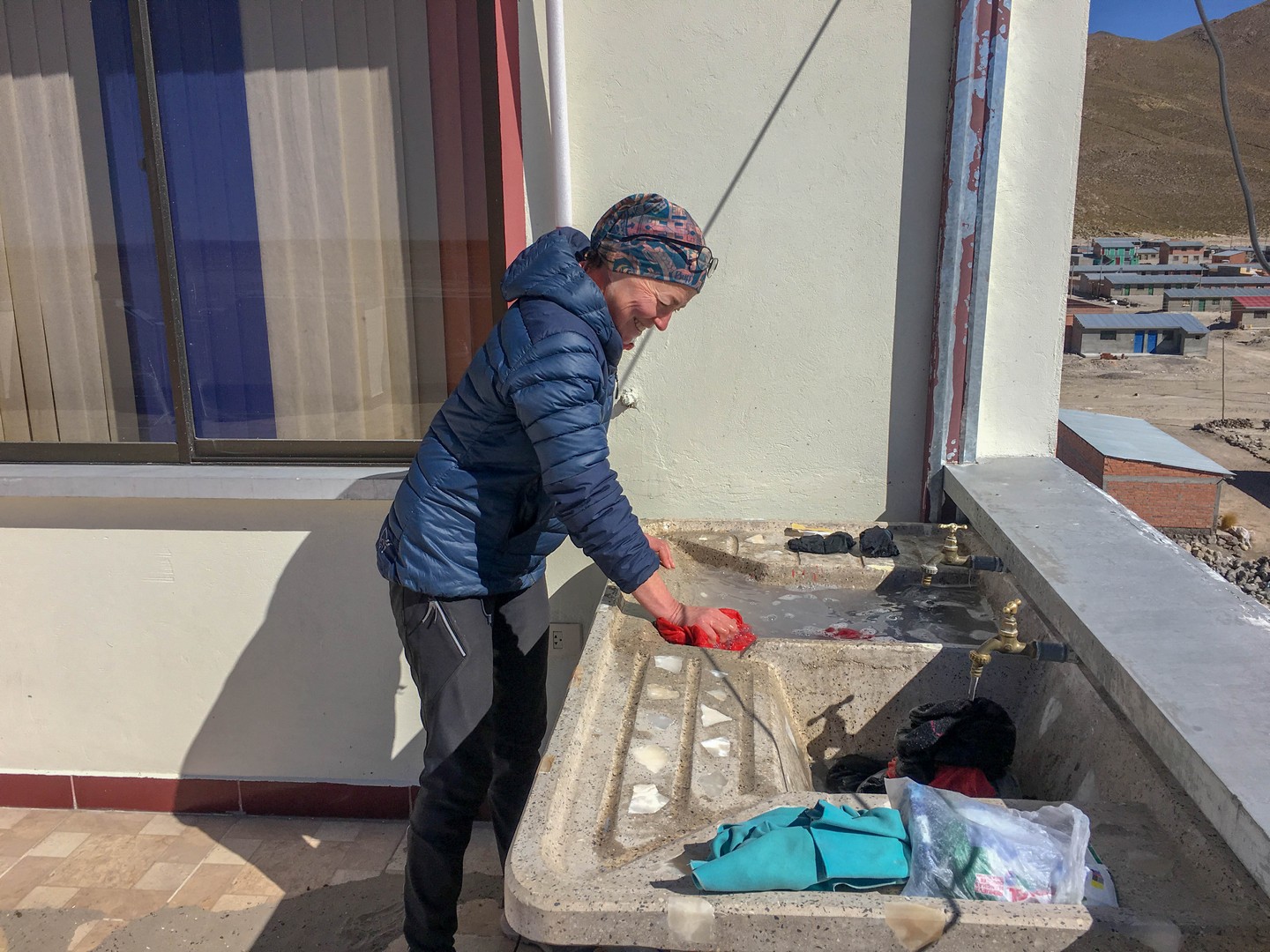 As it was clouded there is also no warm water, no solar heating. We stay an extra day as we need to stock-up and prepare the bikes for crossing the salt flats of Coipasa and Uyuni. I don’t mind as there is more storm predicted. The hotel has a solar system on top of the roof but it freezes so hard during the night that the pipes burst. Wind is not as strong as yesterday.