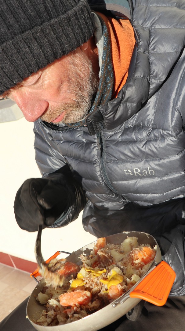 Easy setting up the tent as it is not rock solid salt but rather loose sand. Just before sundown (18:00) we have cooked dinner (onion, garlic, bell peper, carrot and noodles) and are ready to hide in the tent. Taking a bottle of water with us in the tent as it will be -10 C tonight.