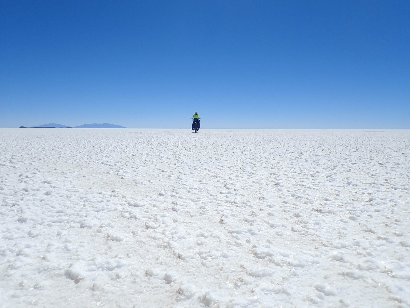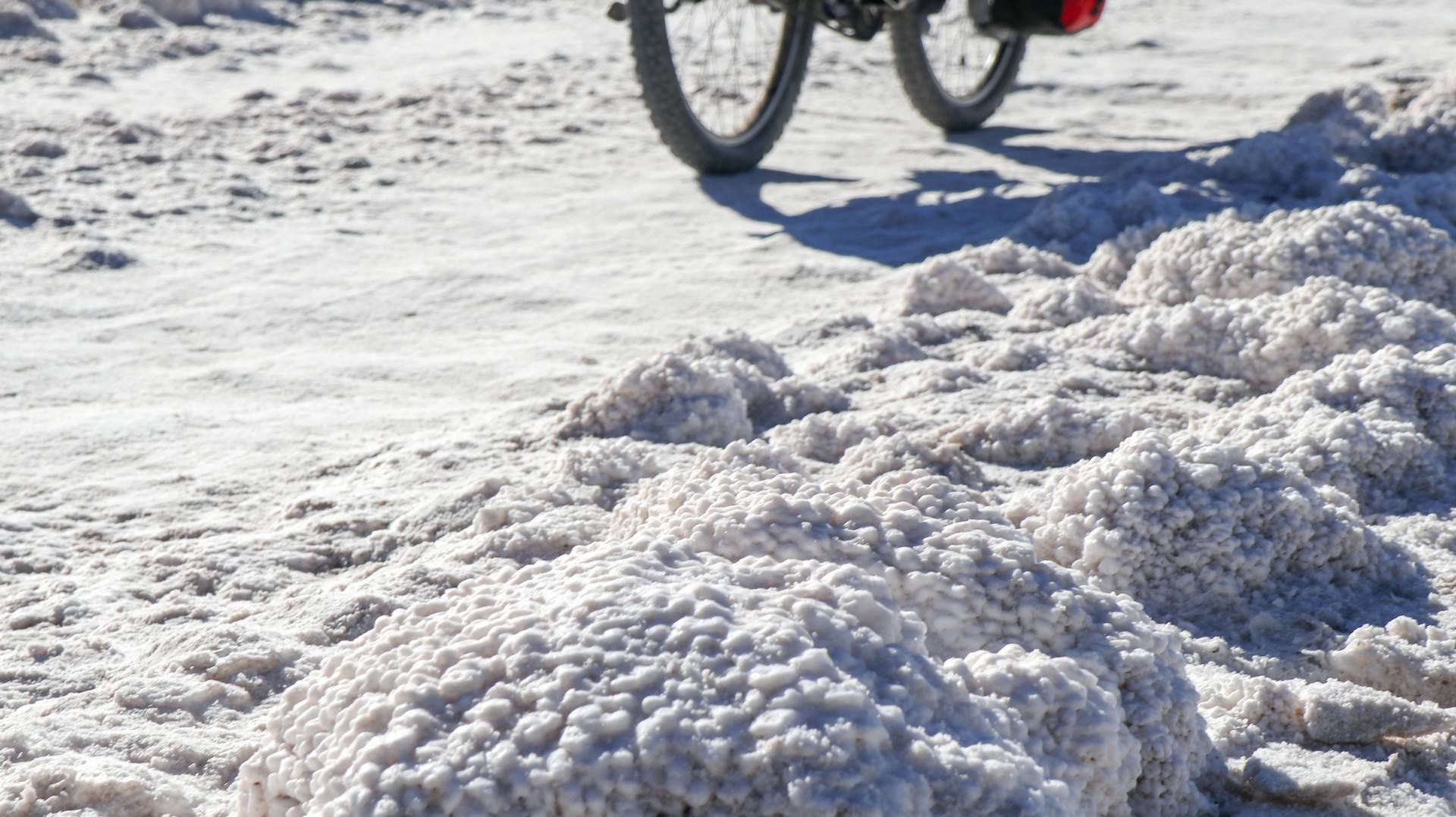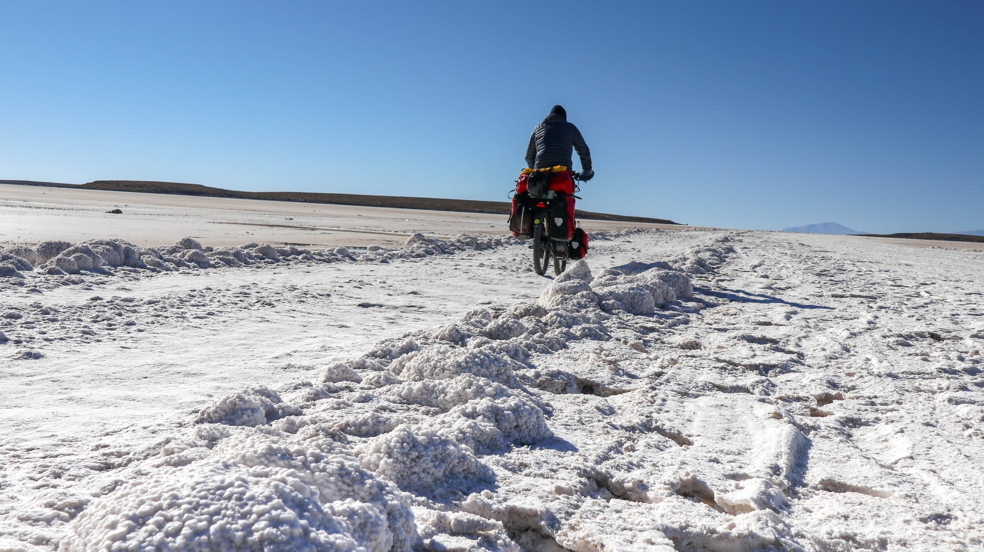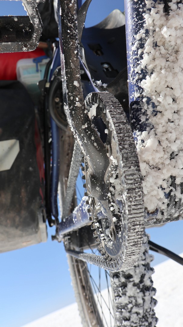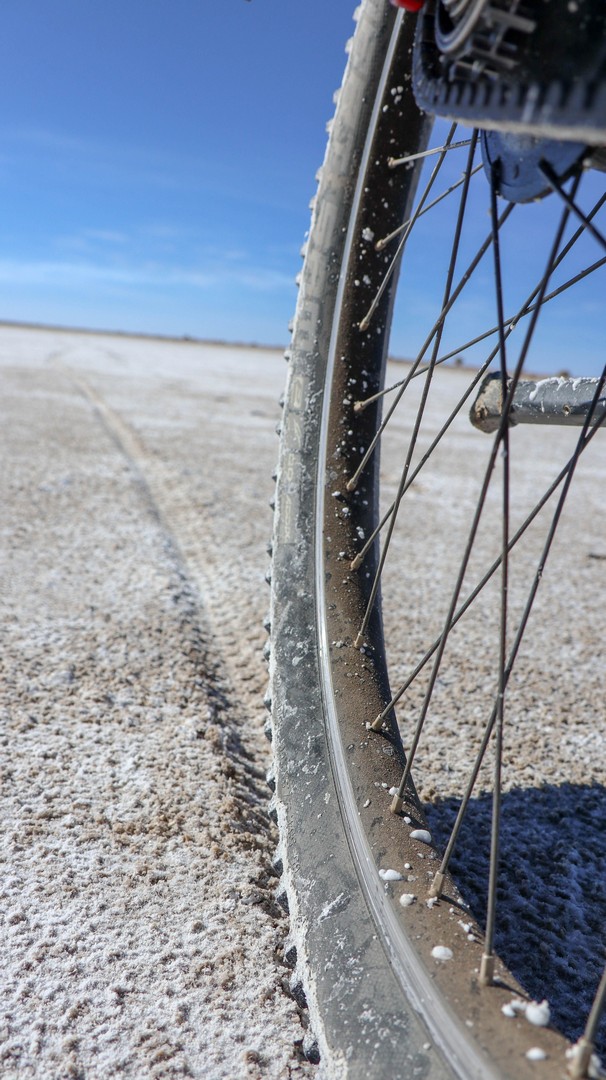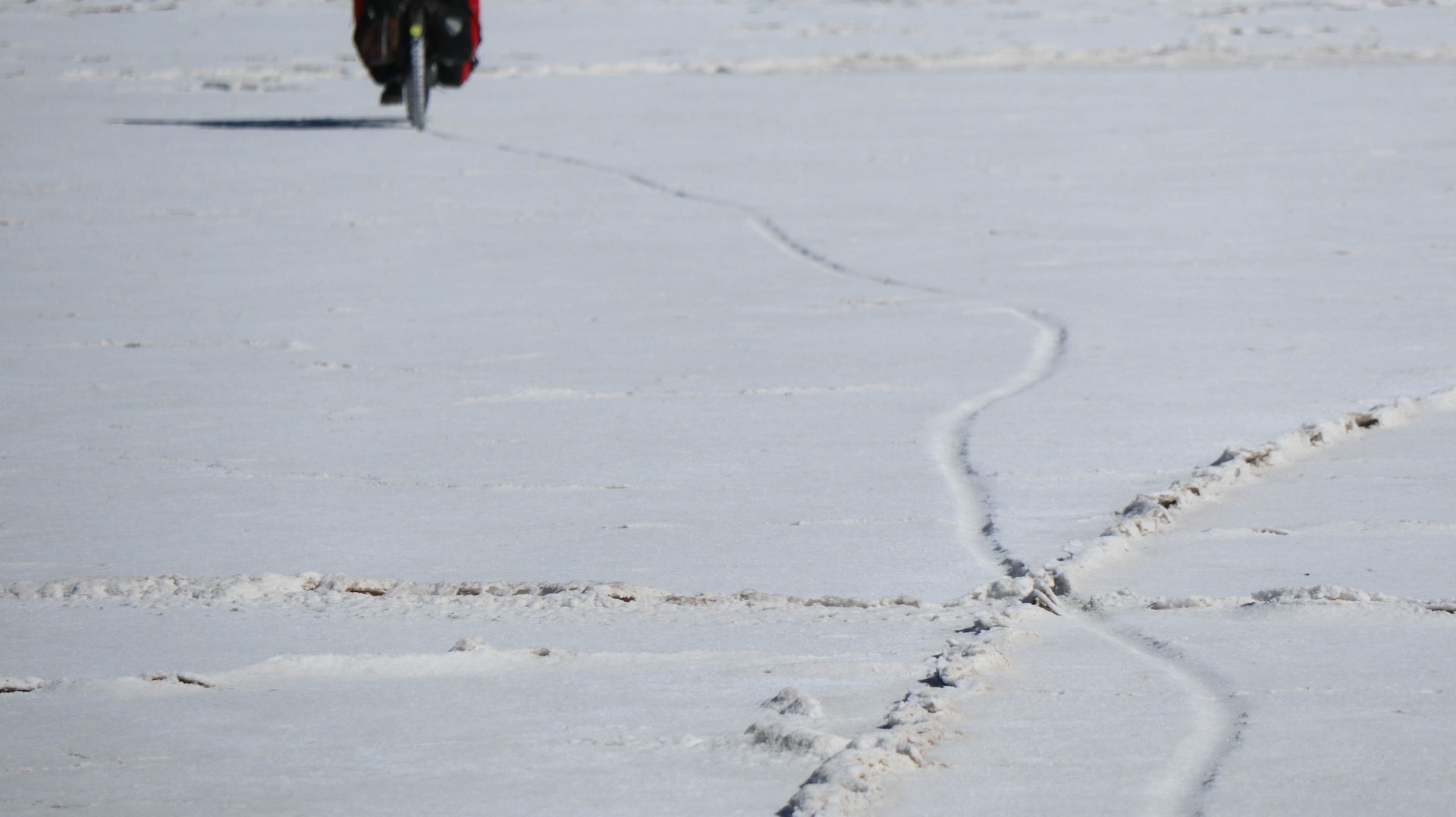 We decide to not bike through the “lake” and decide to create a shortcut over a stretch of more than 30 kilometers. Beautiful structures of the salt. Magical white without any tracks. Aiming for the distant horizon where we should hit the road again.