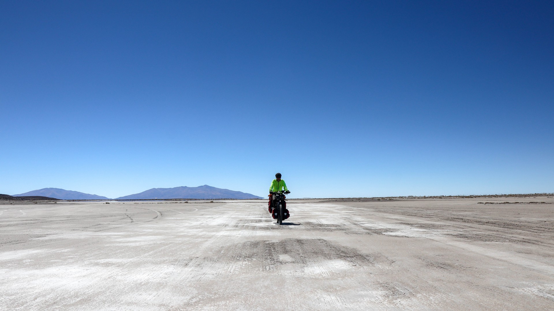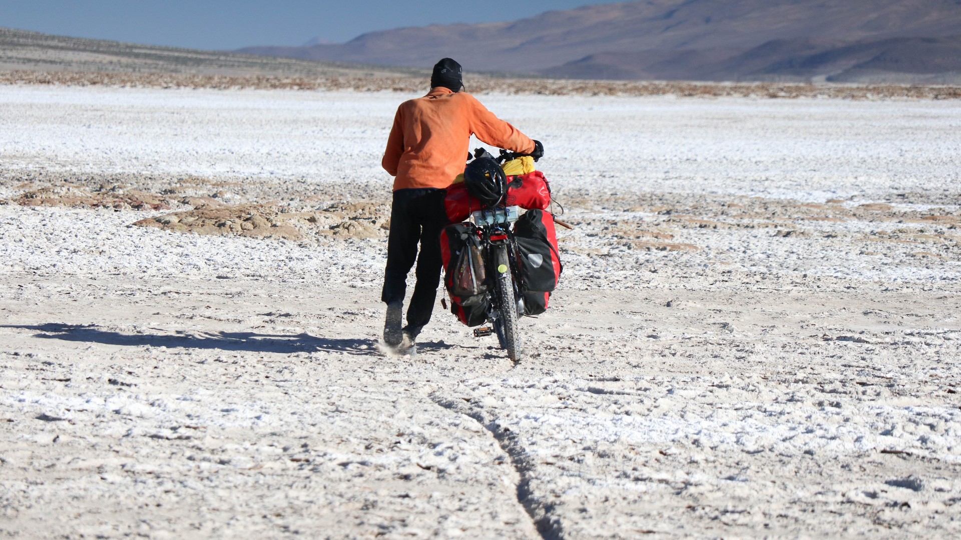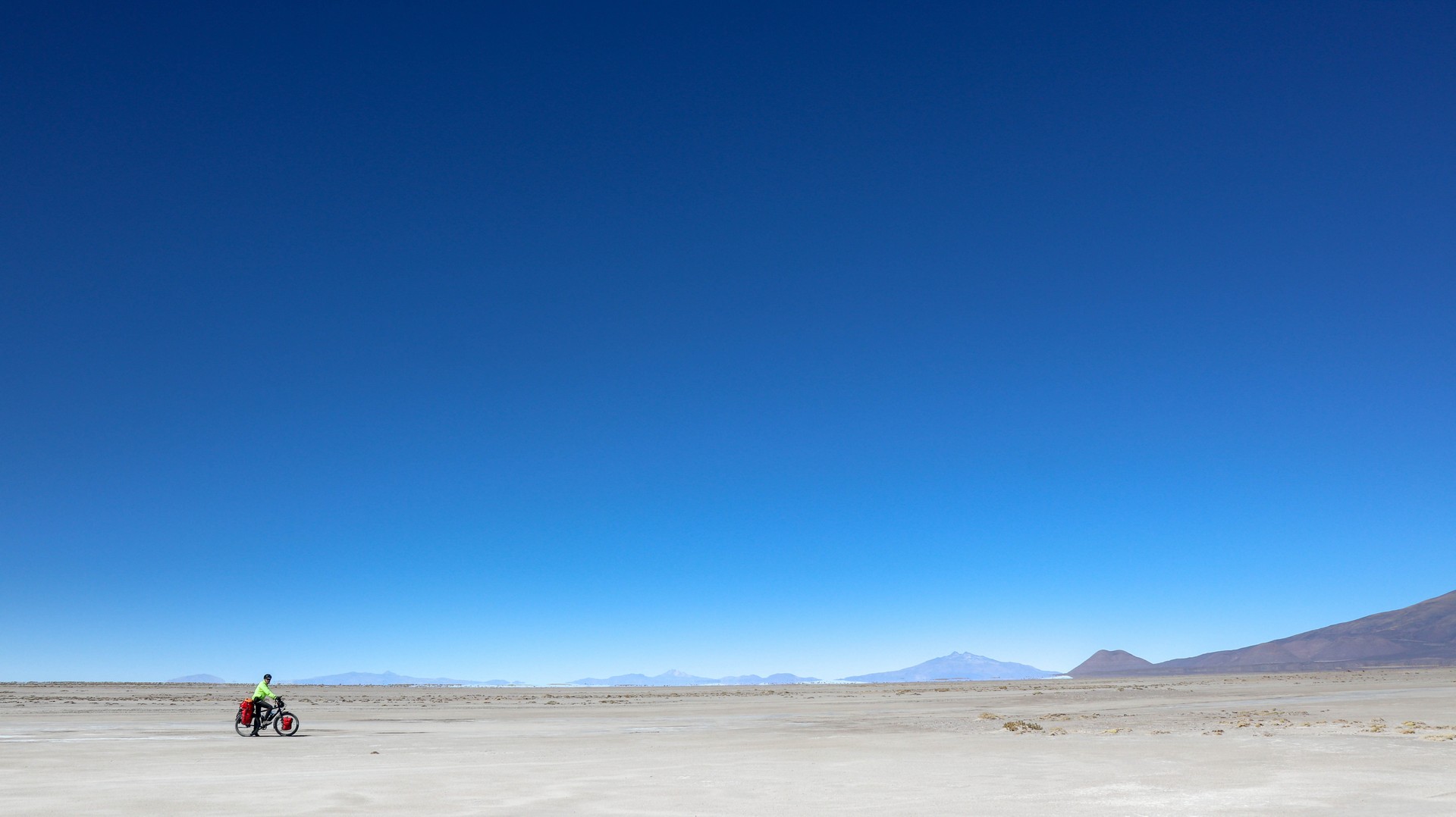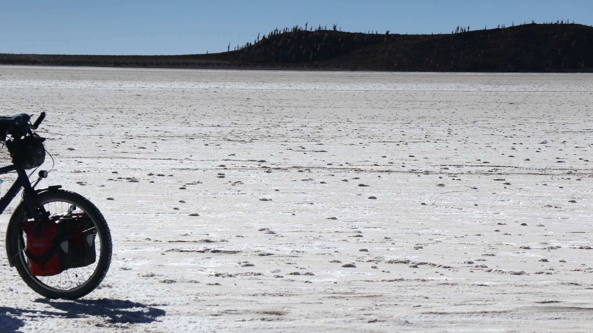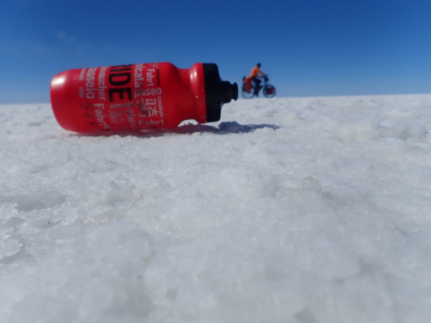 We decide to not bike through the “lake” and decide to create a shortcut over a stretch of more than 30 kilometers. Beautiful structures of the salt. Magical white without any tracks. Aiming for the distant horizon where we should hit the road again.