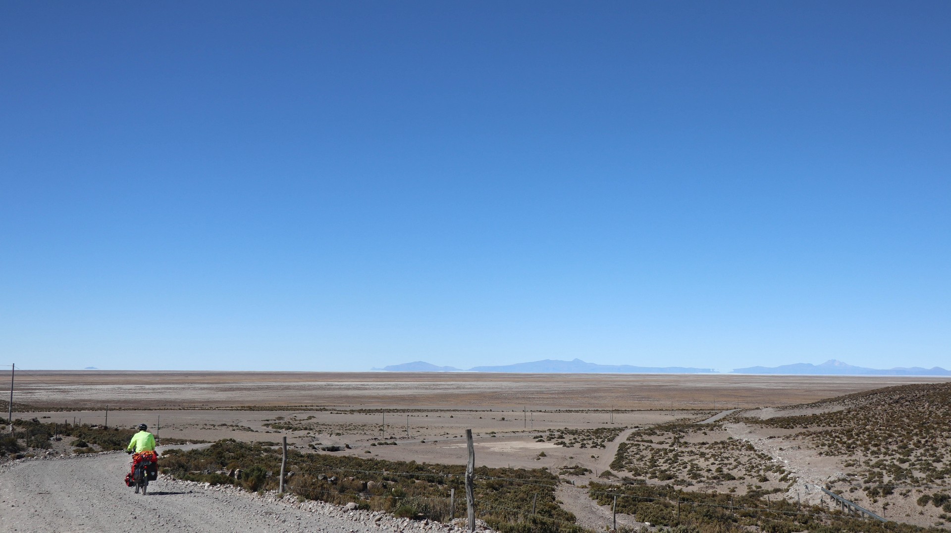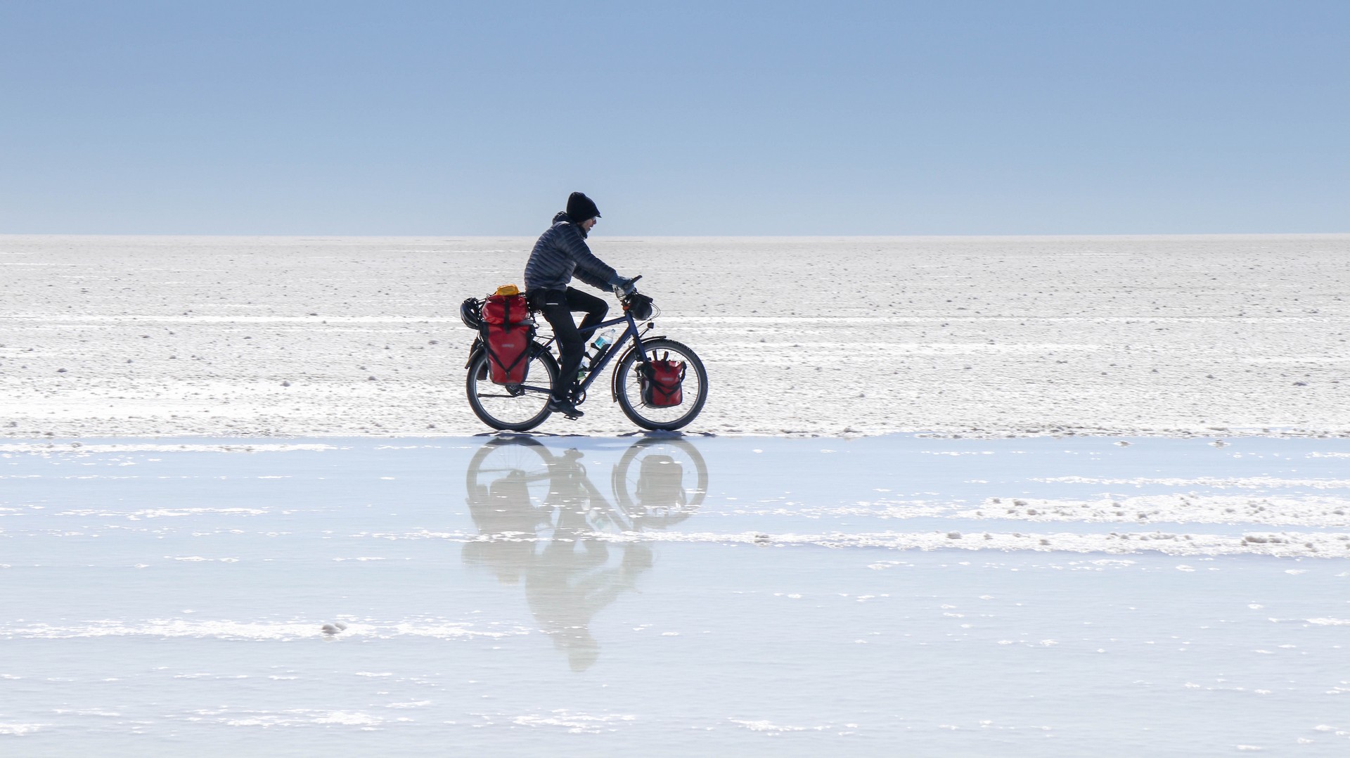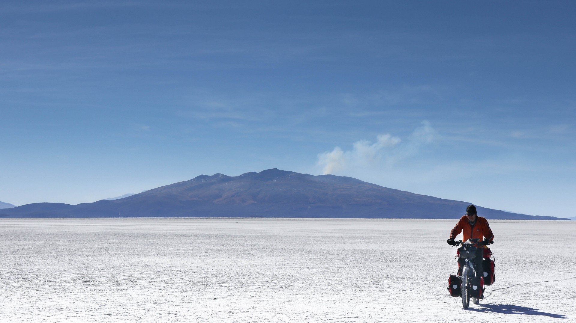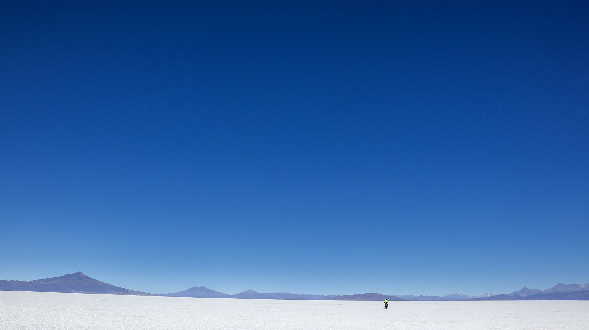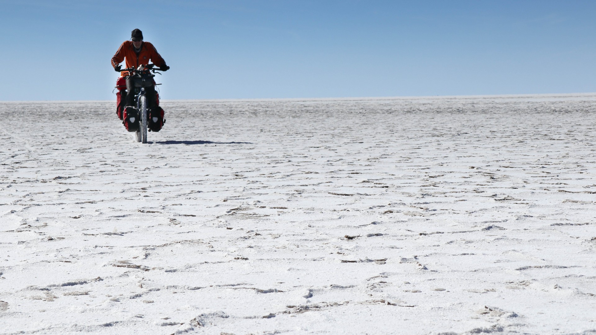 We decide to not bike through the “lake” and decide to create a shortcut over a stretch of more than 30 kilometers. Beautiful structures of the salt. Magical white without any tracks. Aiming for the distant horizon where we should hit the road again.