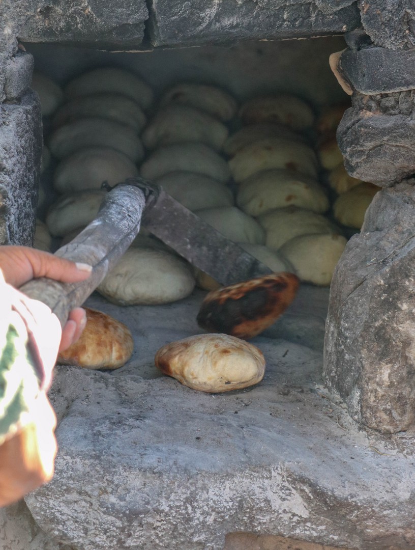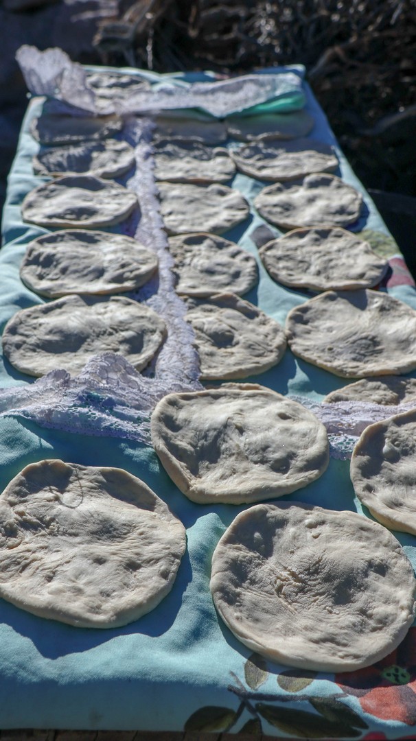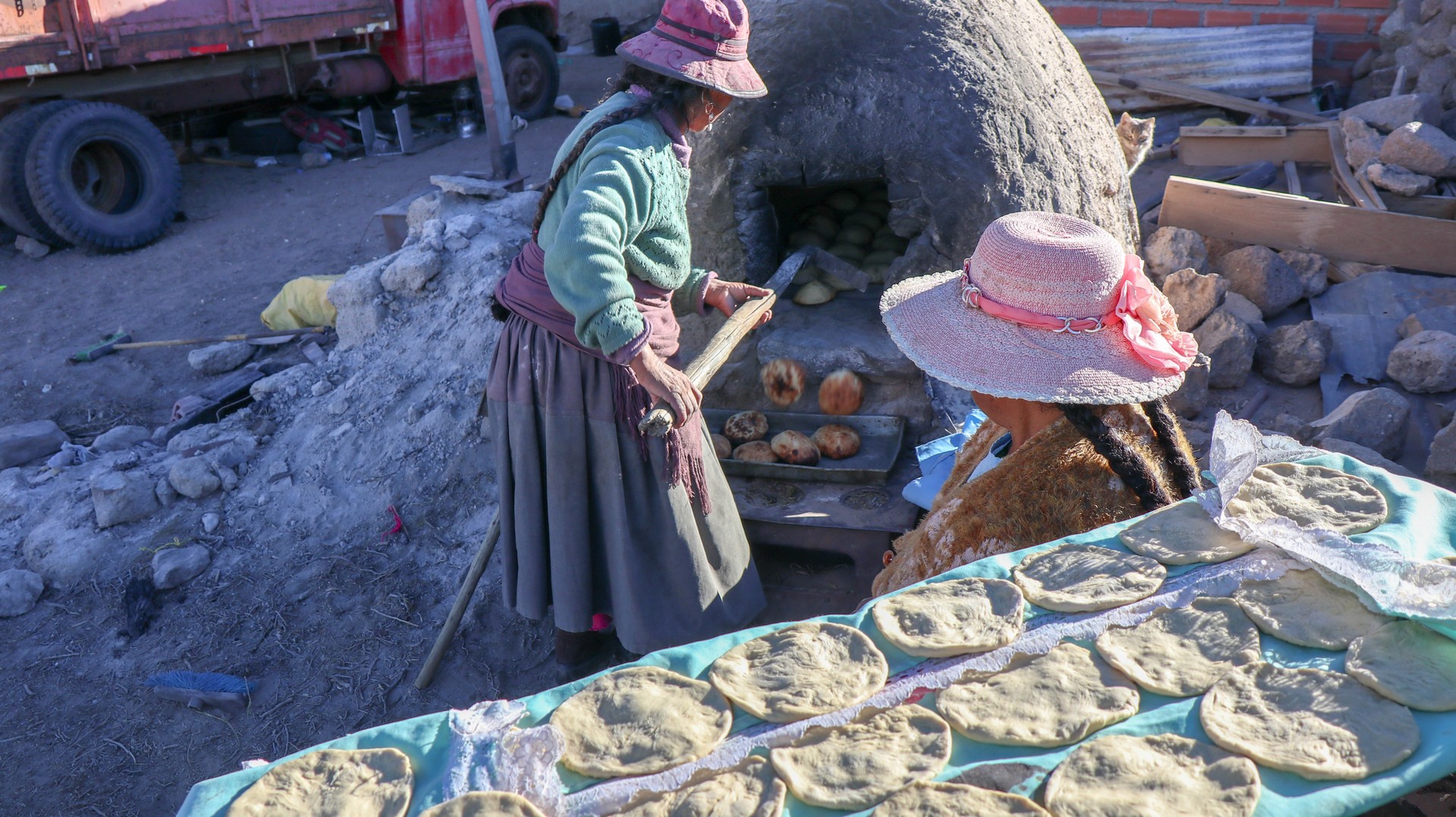 Just in time to follow our landlady to where she is backing her quinoa bread and where the small breads of the village are baked. The oven needs to be heated for 30 min by wood (almost no wood in the whole area!) hereafter they can bake 250 small pita look-a-like breads. They sell 8 pieces of bread for 10 BOB (1.20 Euro). Best ever bread I have had, still warm from the oven! Dinner we cook in the room (on our gasoline stove).