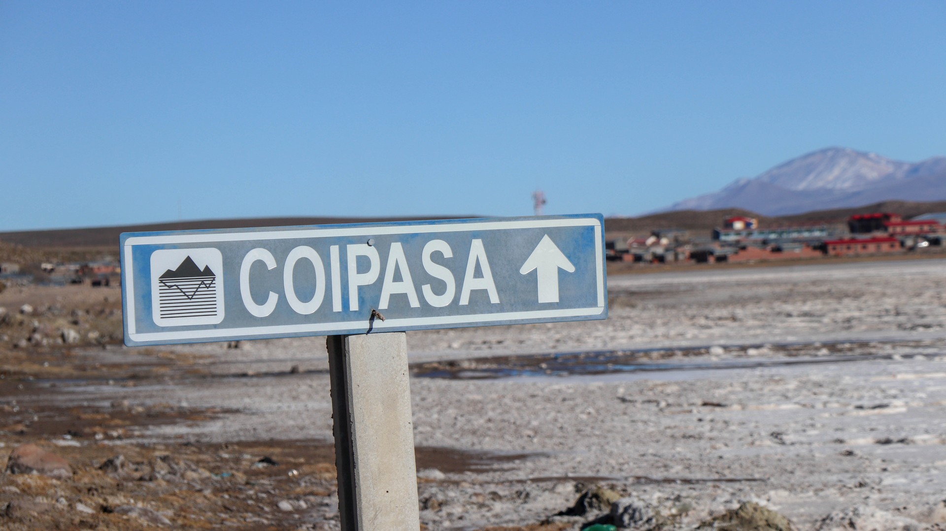 Next day we are really entering the great white nothing of the Salar de Coipasa. In most of the directions we still see volcano cones peaking out of the white flat pancake. As Coipasa is the wetter and smaller sibling of Salar de Uyuni we start on an elevated road.