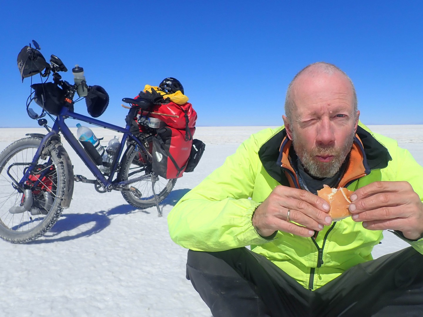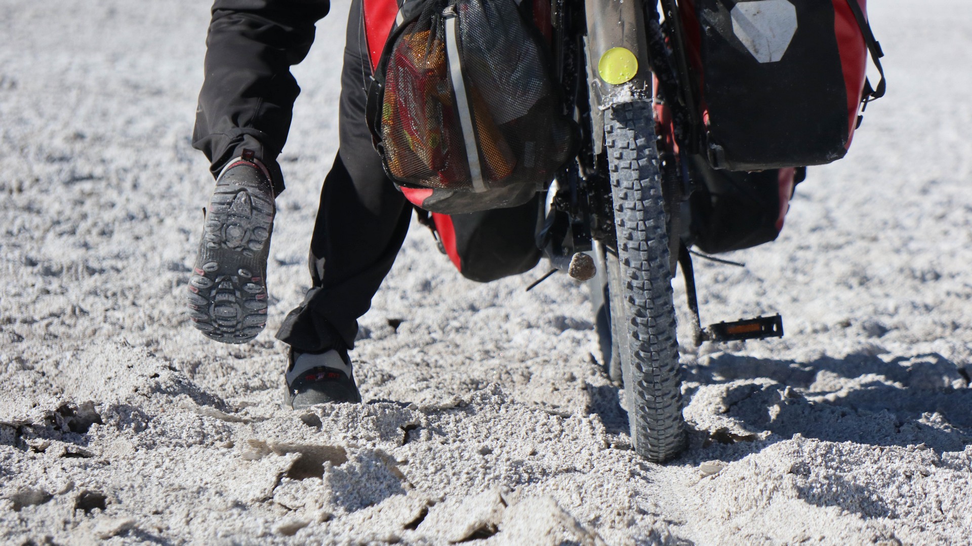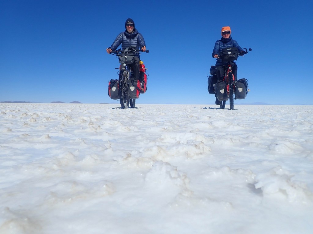 Very different structure of the salt per kilometer. Large areas where it is as if biking over old Inca roads made of hexagonal blocks, big cracks between them making it a bumpy ride, especially for Frank.