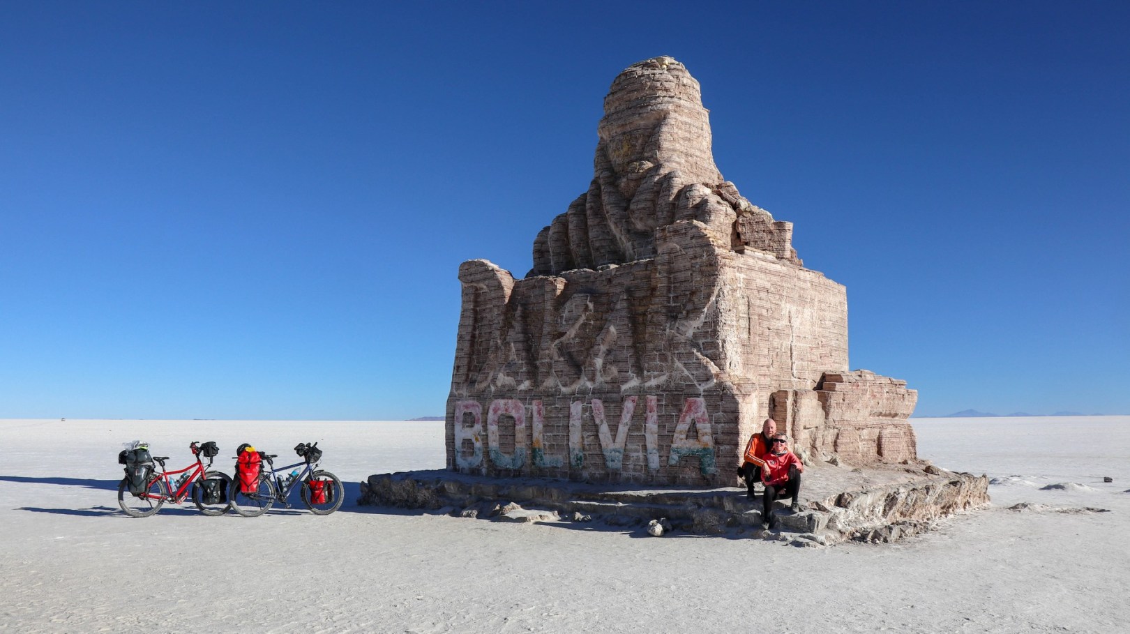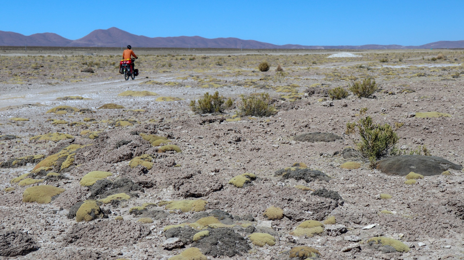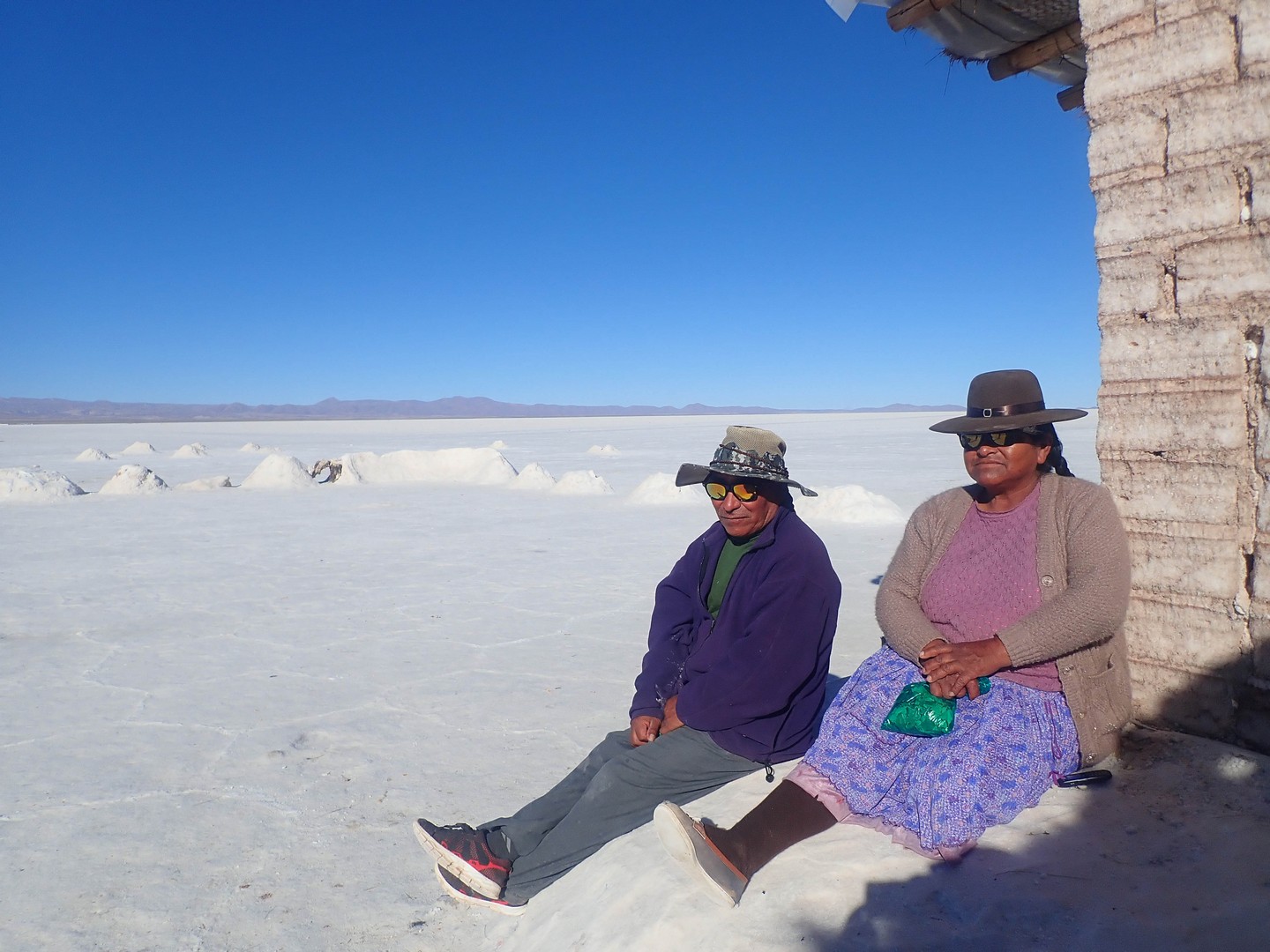 Very different structure of the salt per kilometer. Large areas where it is as if biking over old Inca roads made of hexagonal blocks, big cracks between them making it a bumpy ride, especially for Frank.