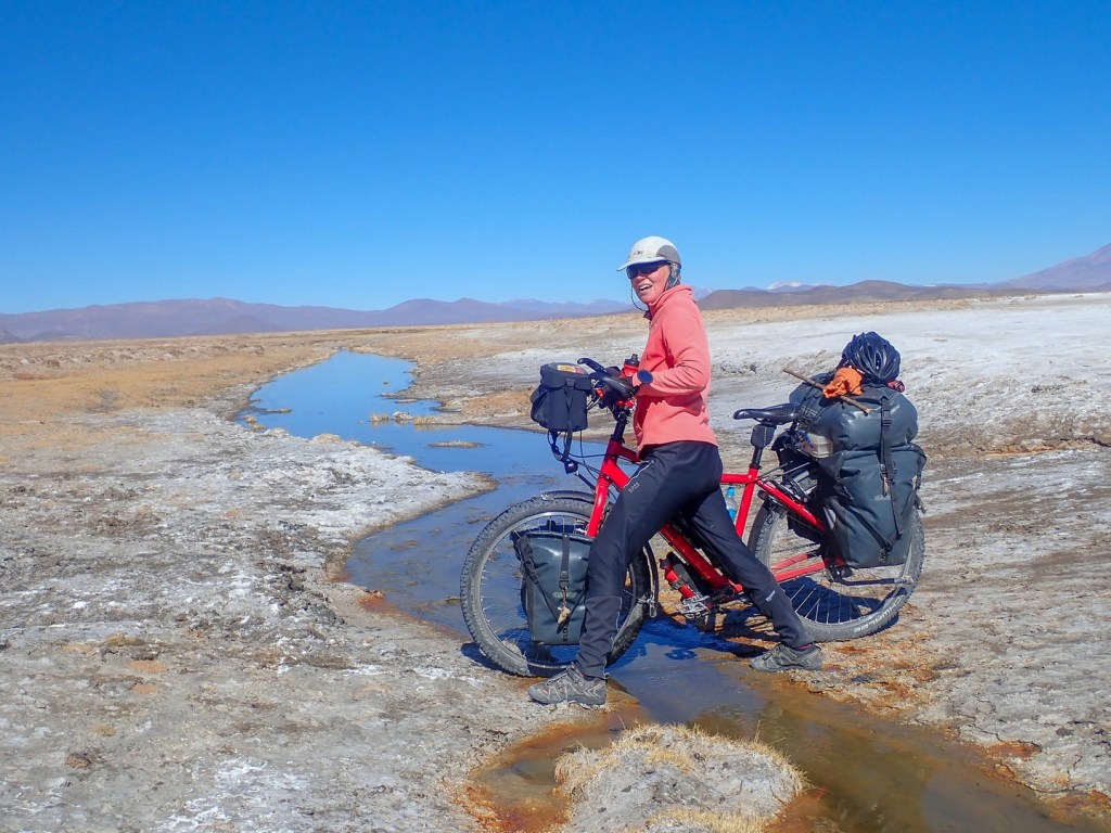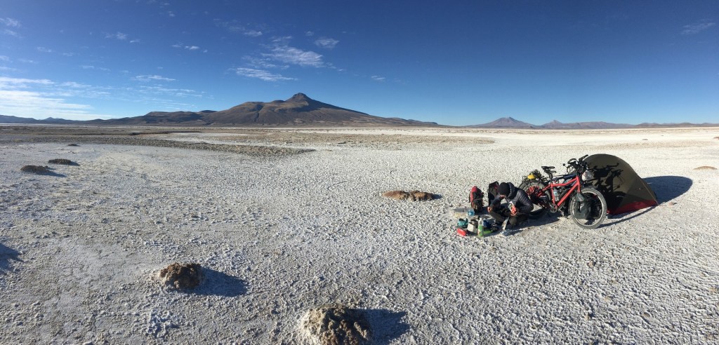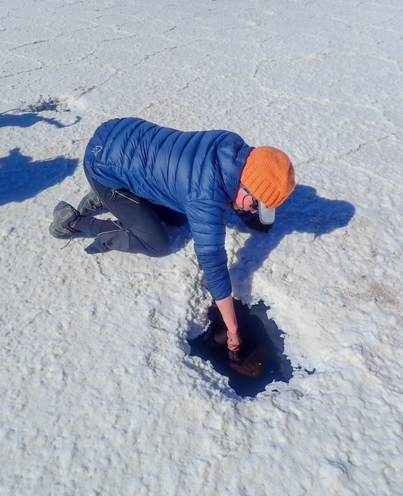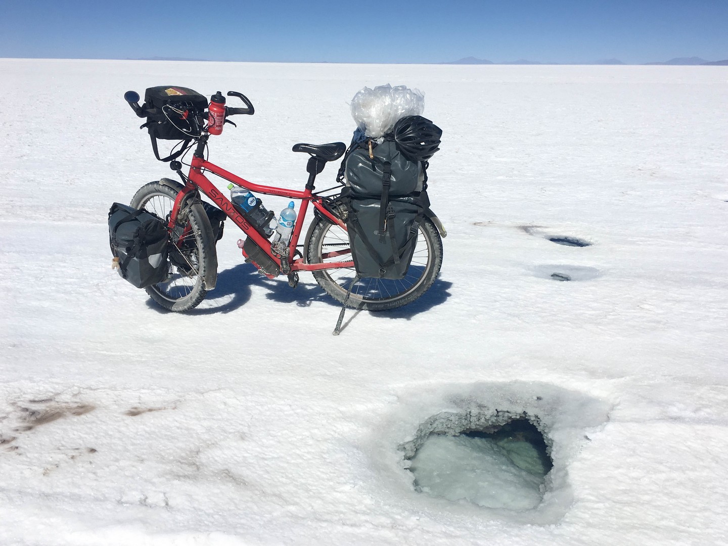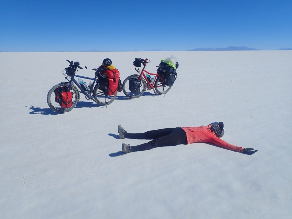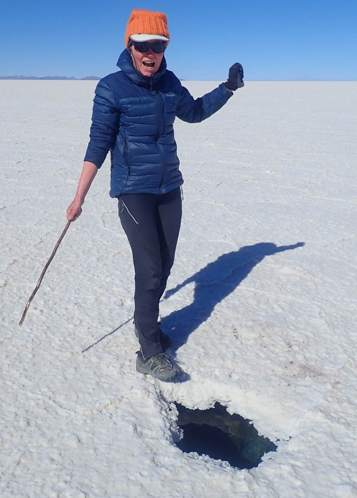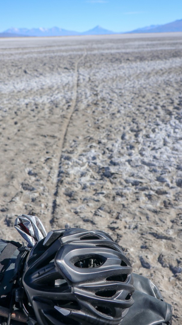 Next day we awe again on the vastness of the Salar and discover holes in the salt. Seems that there is a layer of salt on top of water. The layer is a few centimeters to meters thick. In some places there is no water underneath, in other places a few centimeters to several meters deep. We check a few with our stick and sometimes we feel the bottom and sometimes we feel nothing in the deep blue. Scary shit and it hits me that if the holes are big enough we could drown. Am I starting to bike faster? One thing is for sure that on this stretch you need to look in front of you to spot the holes. During the current season (dry season) the holes are not such an issue as you at least see them. In the rainy season cars can get stuck when they hit one of those bigger holes, which are then under water.