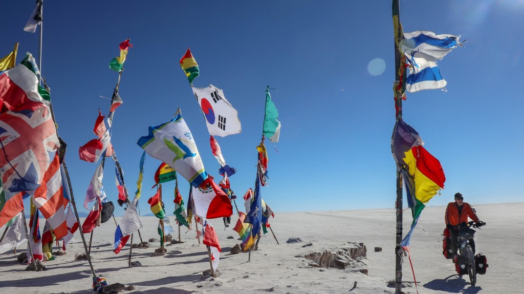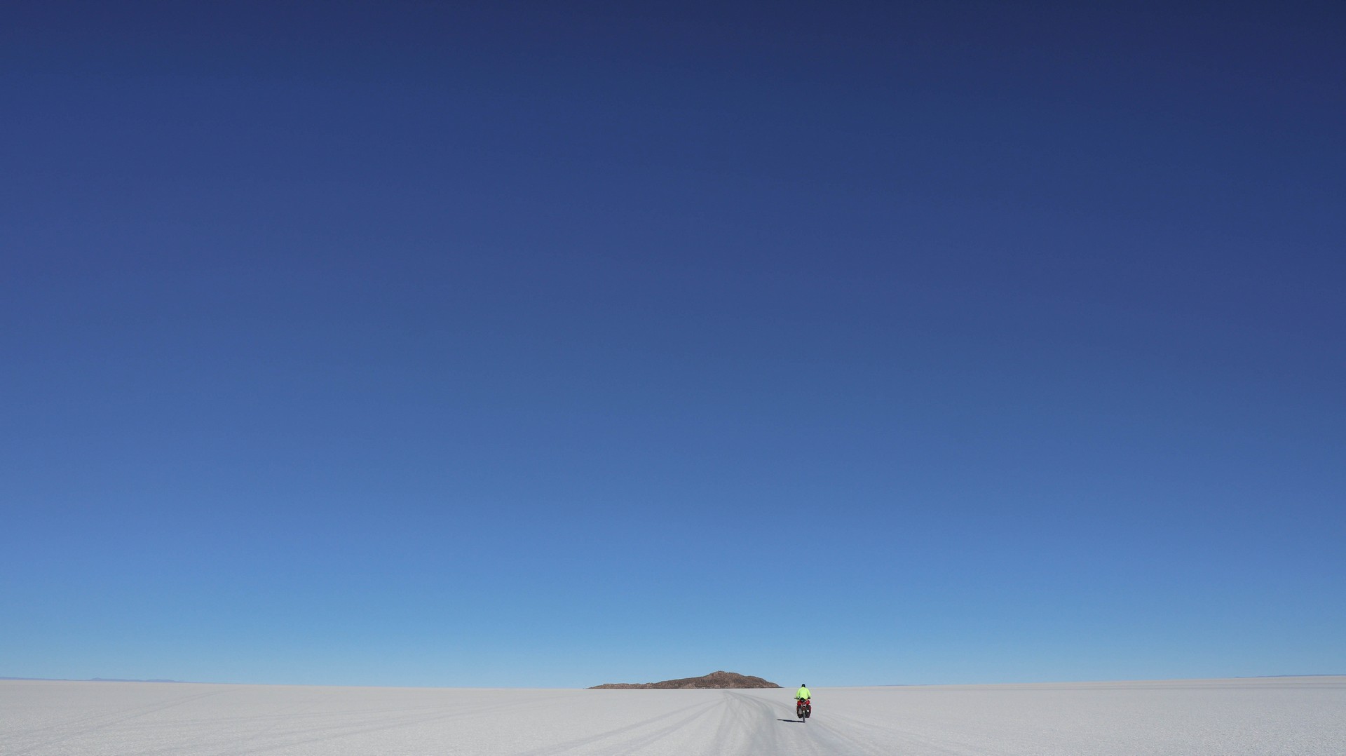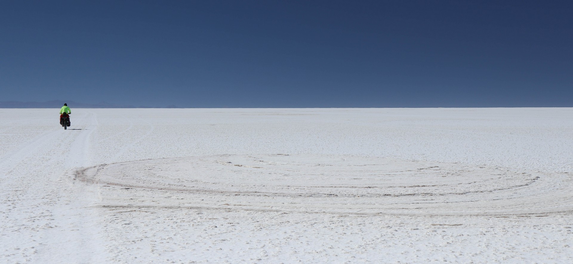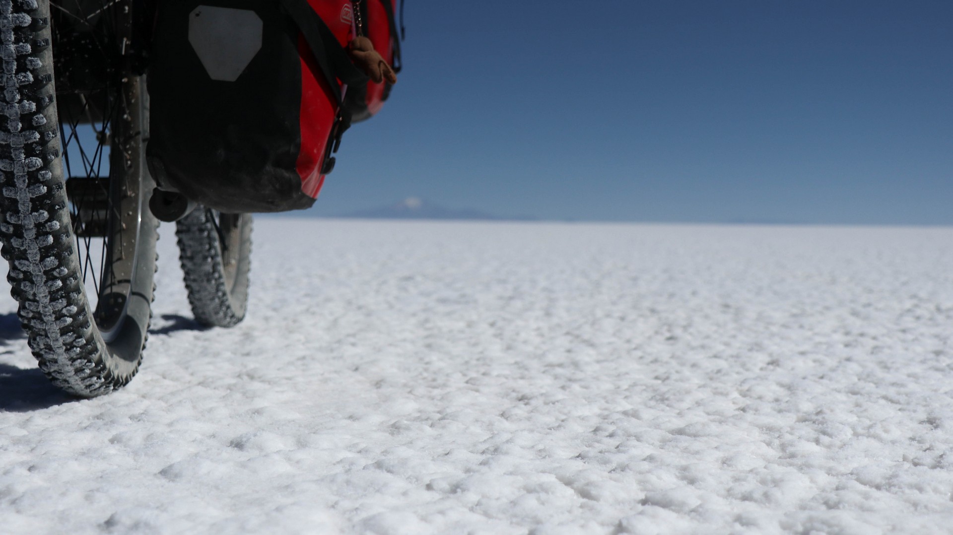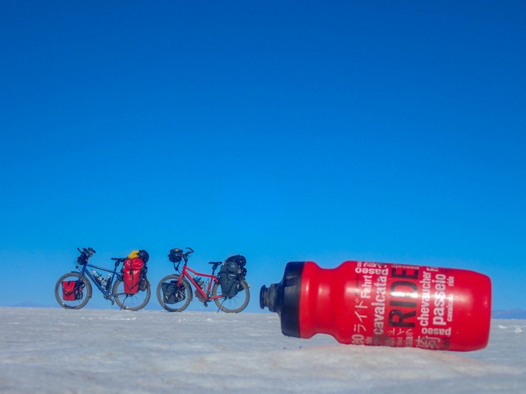 Salar de Uyuni is the largest salt flat in the world. 10,582 square kilometers. Biking over it is different from Coipasa. Where in Coipasa the bikes were covered by salt because of several wet patches we had to bike through, Salar de Uyuni starts with some salt/sand mix but still very firm and then the white open starts. Bigger, whiter, empty.