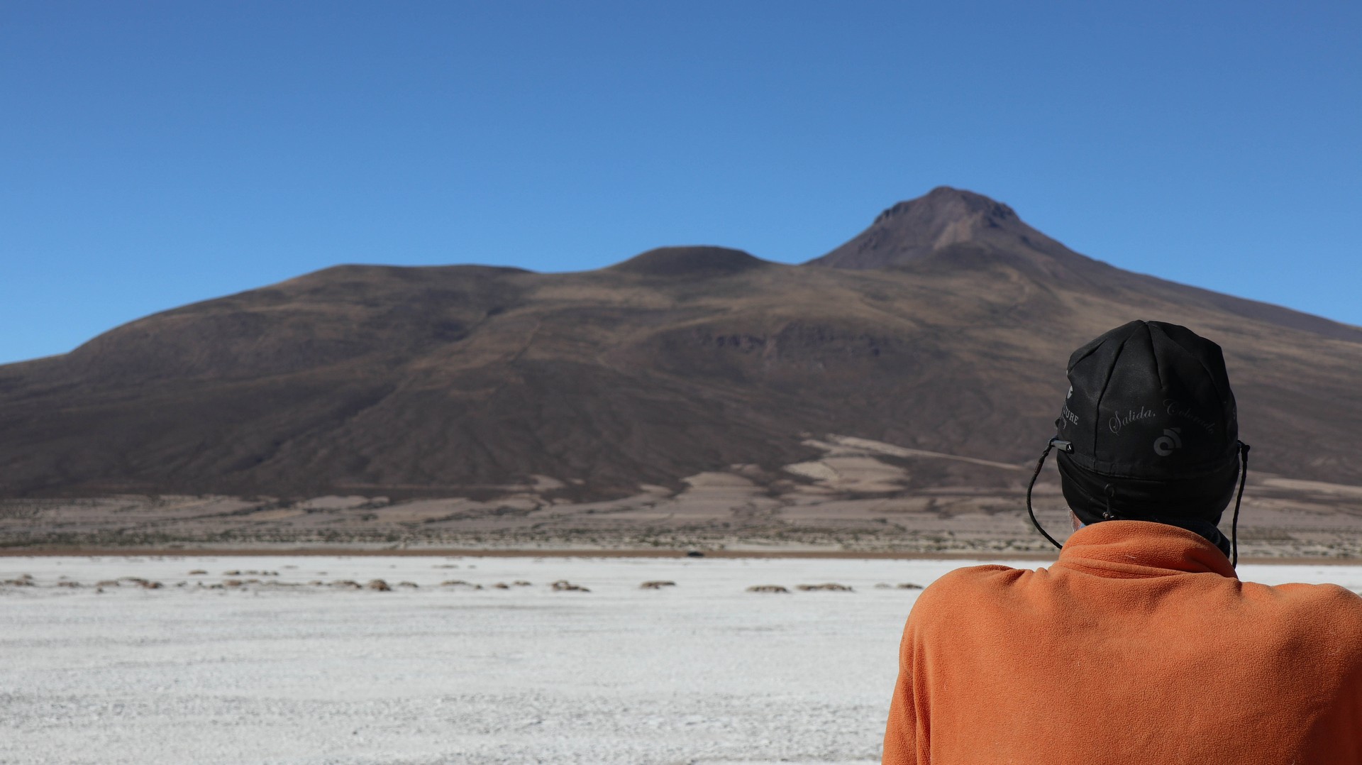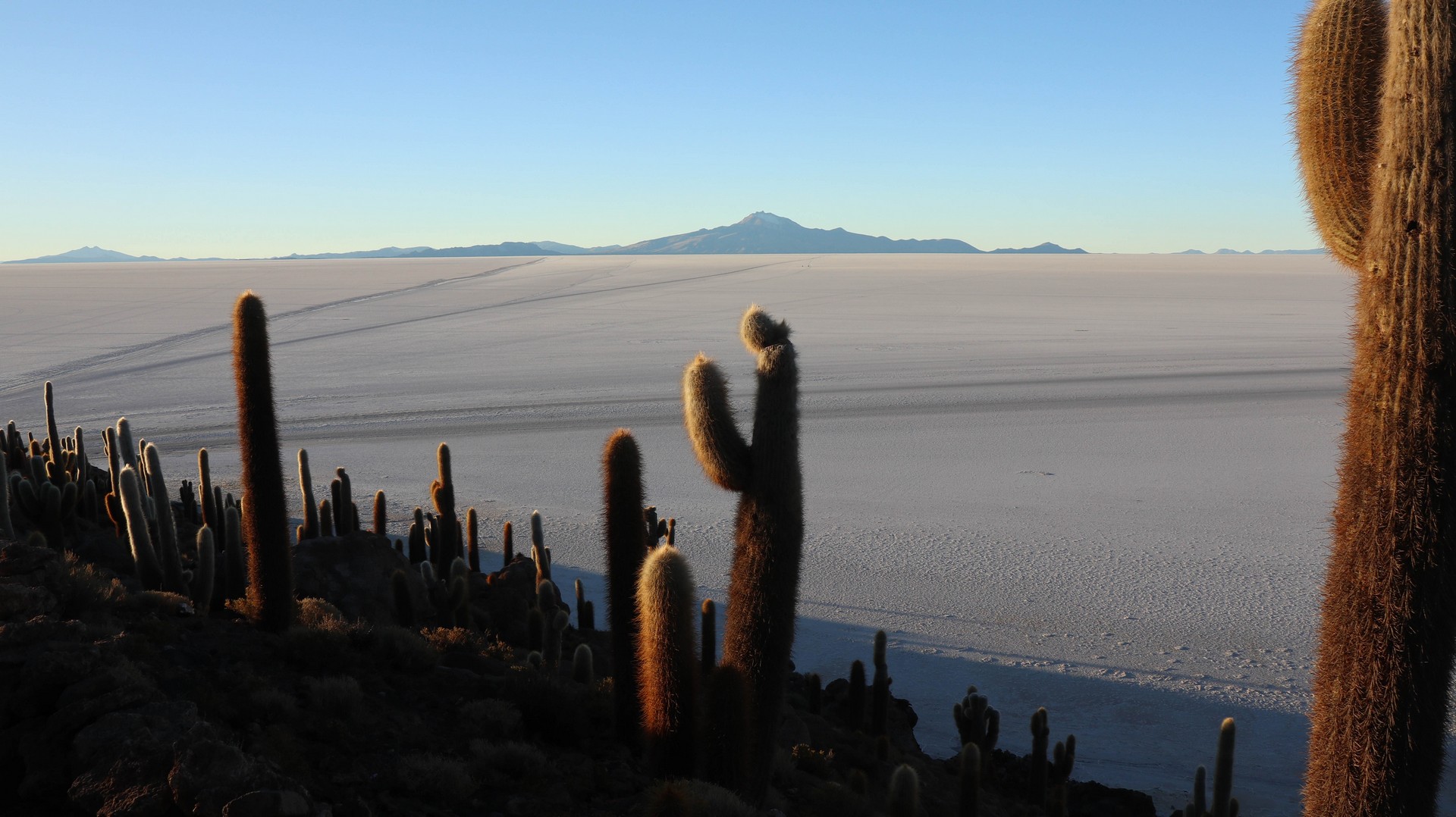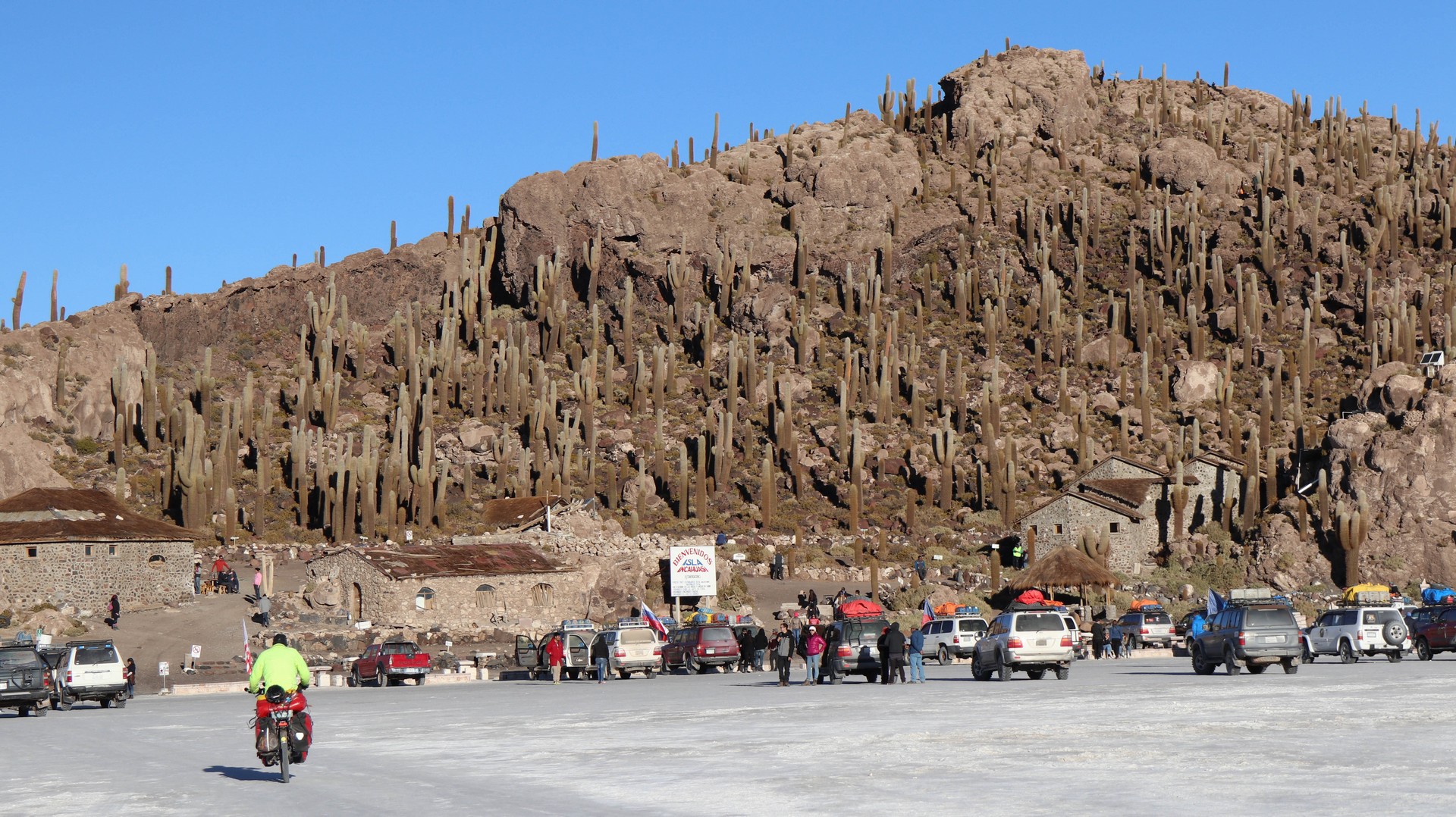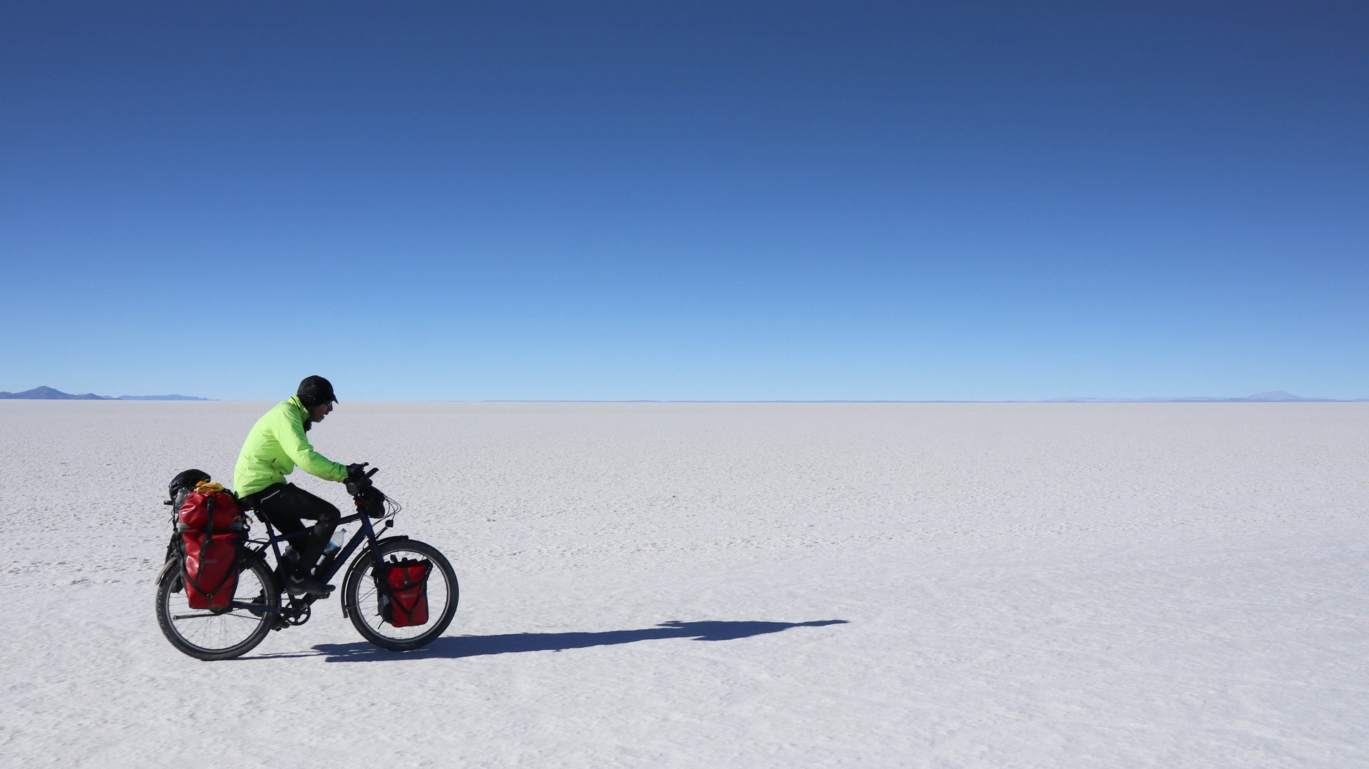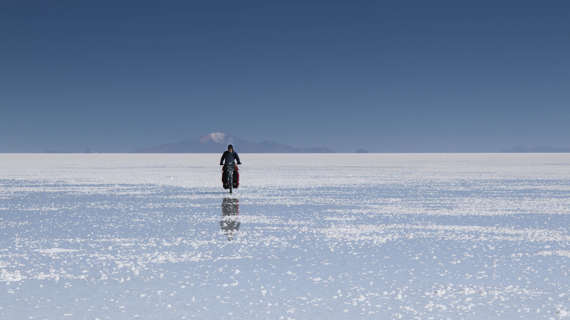 Salar de Uyuni is the largest salt flat in the world. 10,582 square kilometers. Biking over it is different from Coipasa. Where in Coipasa the bikes were covered by salt because of several wet patches we had to bike through, Salar de Uyuni starts with some salt/sand mix but still very firm and then the white open starts. Bigger, whiter, empty.