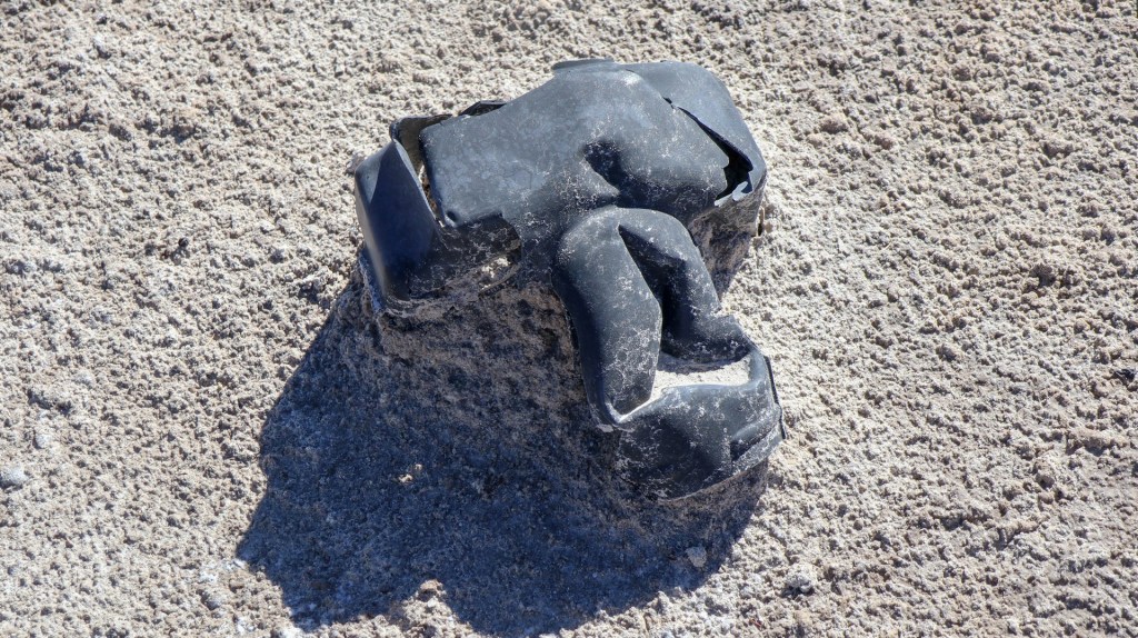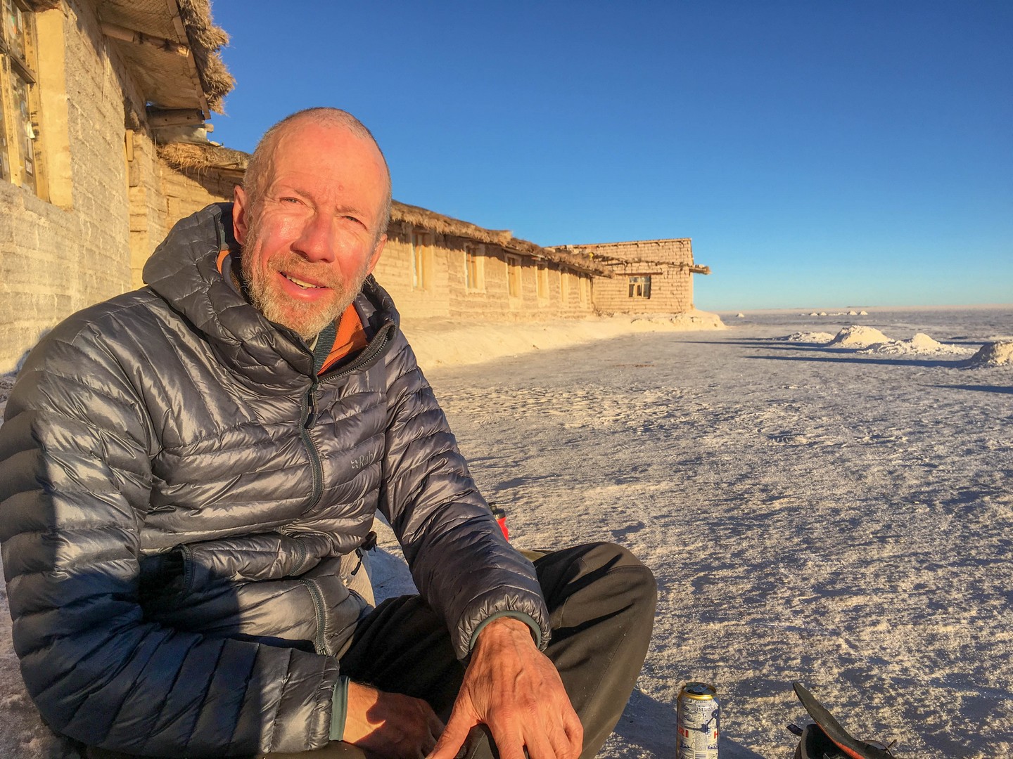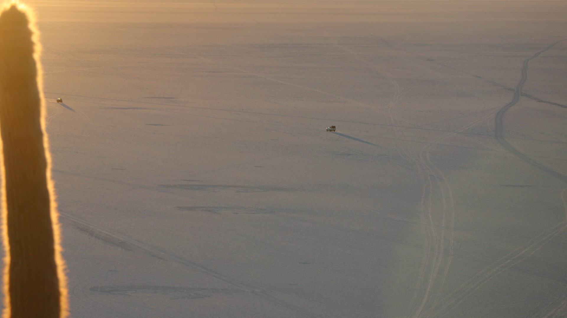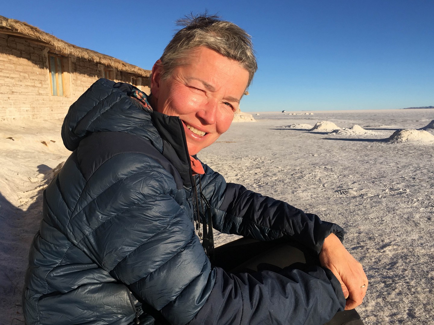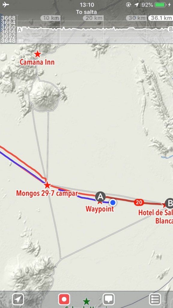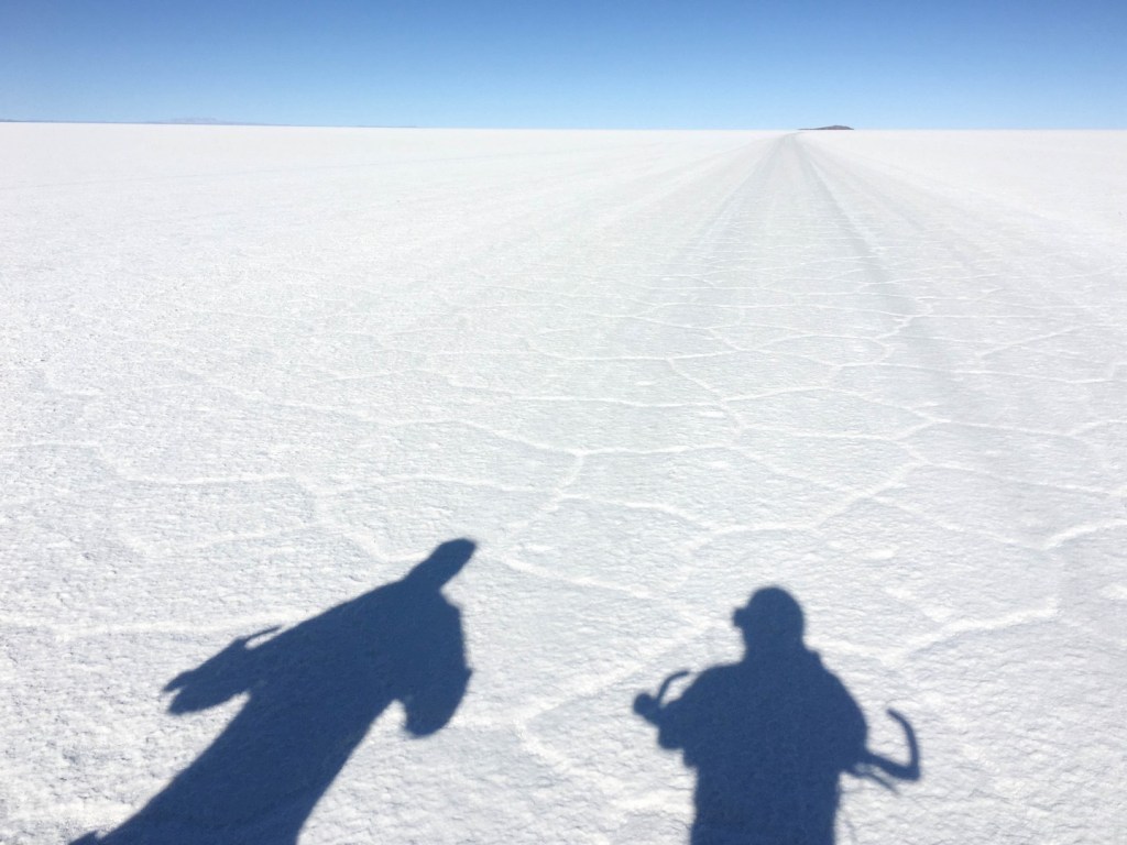 The whiteness is so bright, the sky so blue, the wind so cold that it is a bit like winter sports in the Alps. We still have MapOut tracking our route, as the jeep tracks are going all over the place and we want to be sure we are heading the right direction. In the morning I did not follow the tracks for a while, only looking at the salt, not in the distance and before you know it you are several degrees off track.