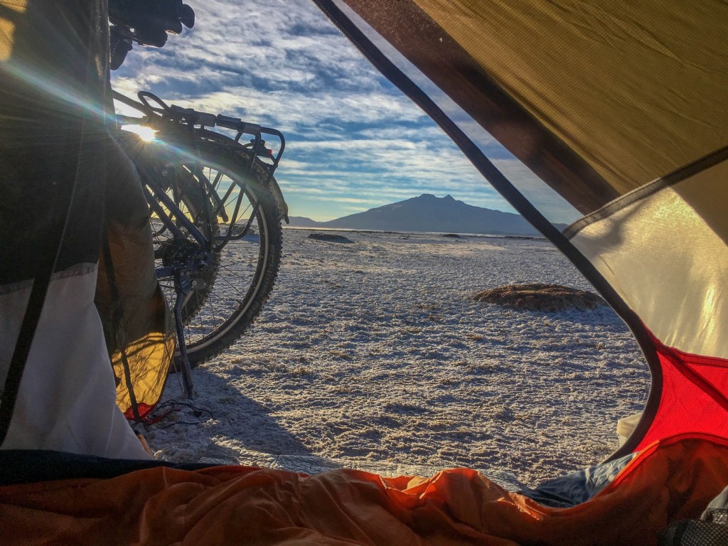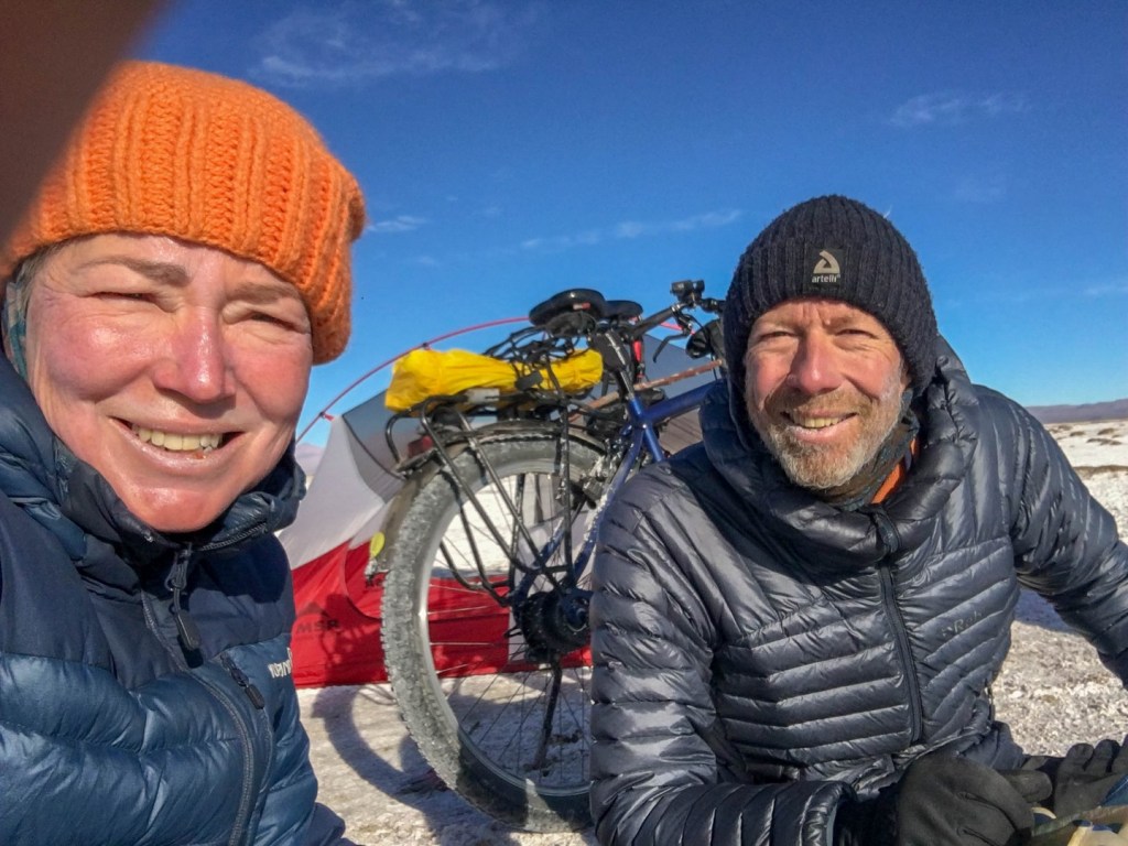 A few nights earlier it was already around zero and we knew that sleeping with a thin layer in our sleeping bags would not be sufficient. Our Exped sleeping bags are up to -12 C. After following some WhatsApp discussions on how to keep warm when it is so cold, from a group that is also cycling from North to South, we tried to sleep with what was suggested. Most important is to ensure to put everything on before you are getting cold.