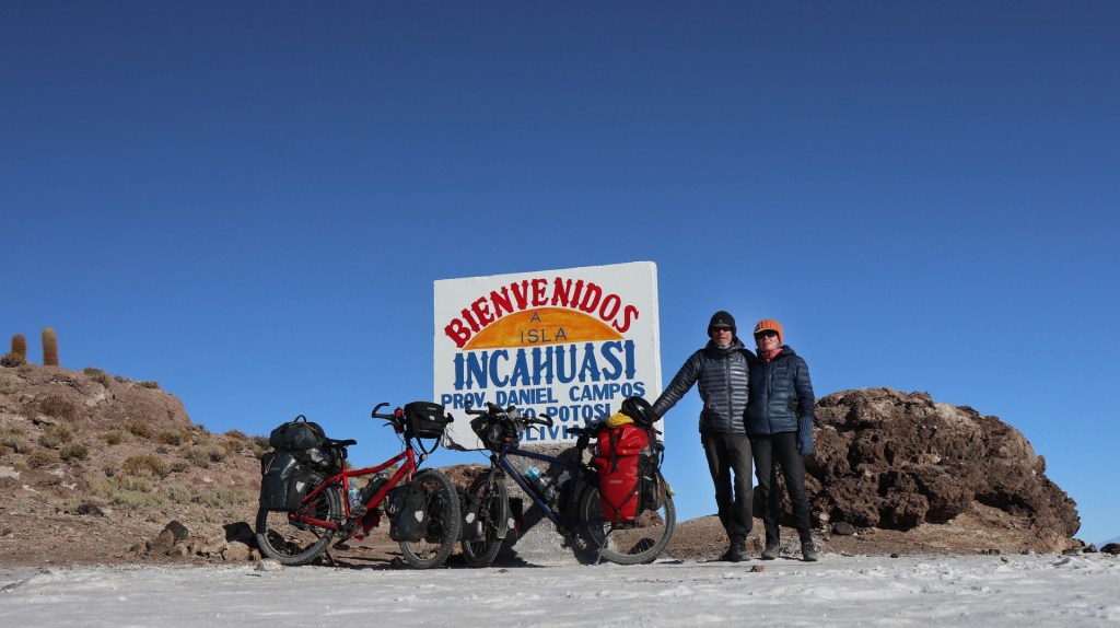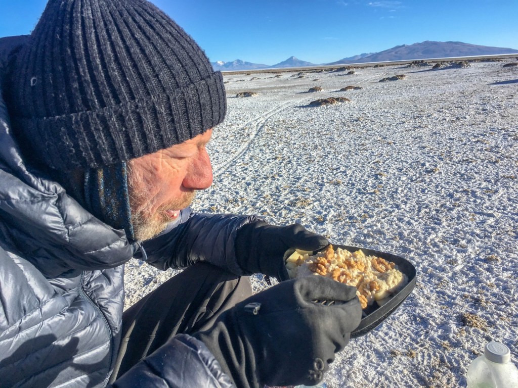 Dusty, altiplano village which is not swept by tourists. First hotel is even closed and when we call them they don’t bother to open for two people. Frank finds a good other place. What a remote life people live here. Small, friendly, dusty shops all sell the same basics of carrots, tomatoes and pasta/rice. Still you need to visit a few to find all described above. People are friendly and welcoming. Stocking-up with food and water for the next two days for when we will be crossing Salar de Uyuni. Only dinner we can find, as we don’t want to cook in the room, is Pollo Abrazo, grilled chicken with rice and fries. We sleep with our sleeping bags as it still around zero in the room and we don’t like to sleep with heavy woolen blankets. Breakfast is oatmeal cooked in our room 😊. At least temperature rises. Shower was freezing so full wash needs to wait for a few days.