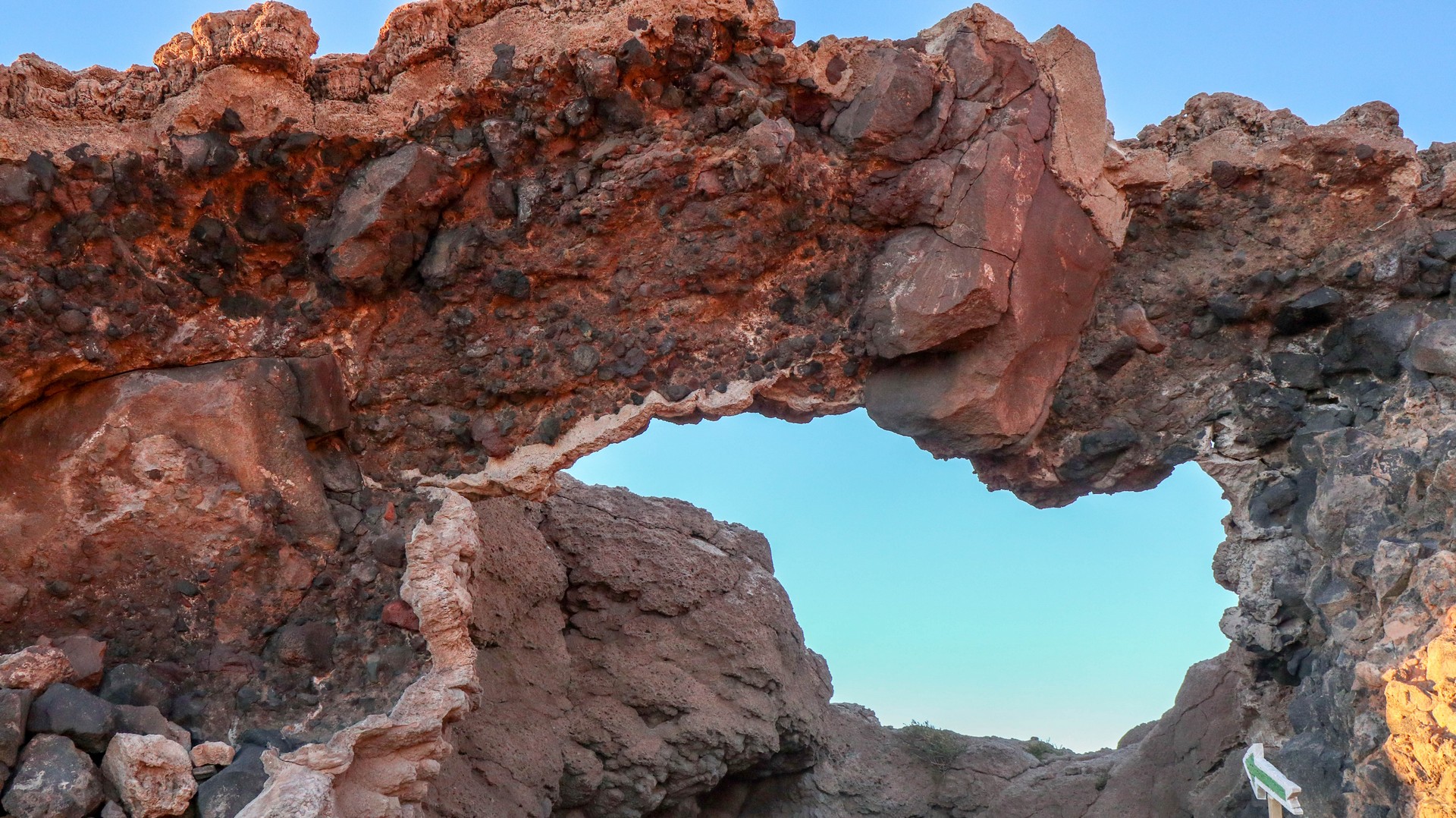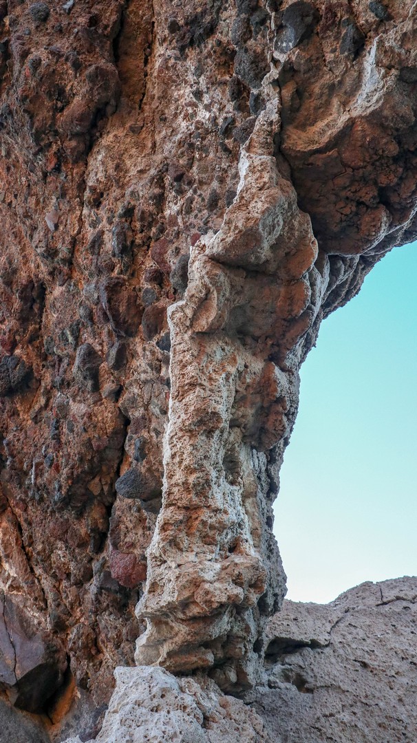 Lava tunnels and coral structures, black rocks and sand.