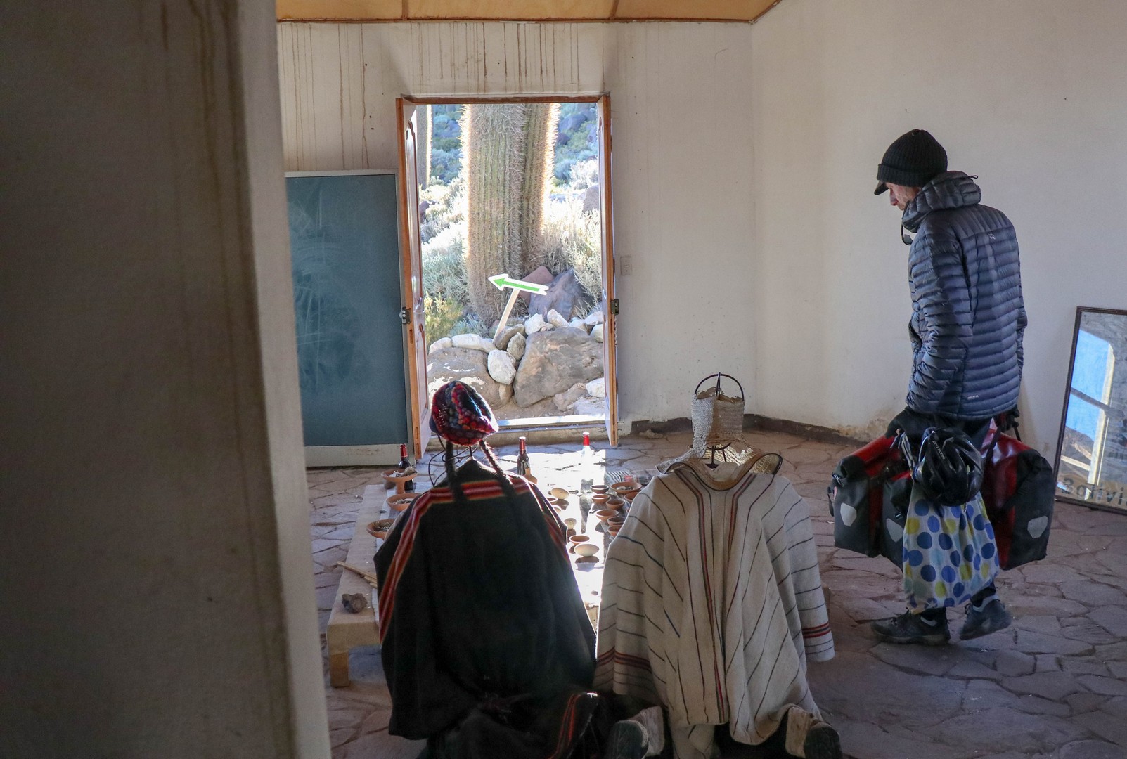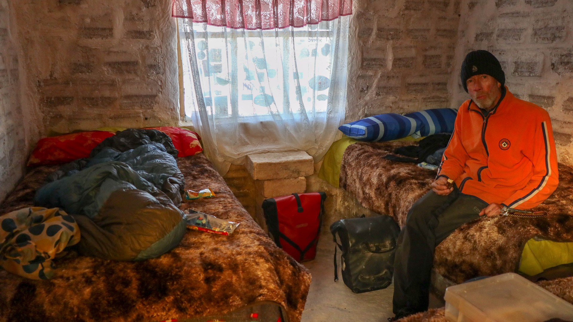 As bikers we only have to pay the locals entrance fee (tourists pay double). And they offer us an empty room in the empty museum. As Frank has been so cold yesterday we do except this kind offer. We just use our mattresses and sleeping bags and regret not putting up our inner tent as during the night we hear several crawling creatures. Dinner and breakfast are cooked inside the room. Almost like camping as there is no electricity or running water.