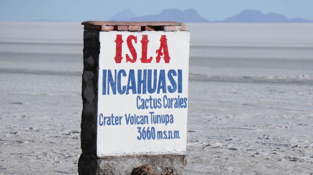 A dark, tiny cone in the distance, mapout guiding us to the right one as there are a few. It is the tip of a volcano which was emerged in the gigantic lake millions of years ago. What a wonder of nature this is. It is Isla Incahuasi, more or less located midway to Uyuni and we know we can resupply with water, maybe even sleep in a shelter, with a double feeling heading that way.