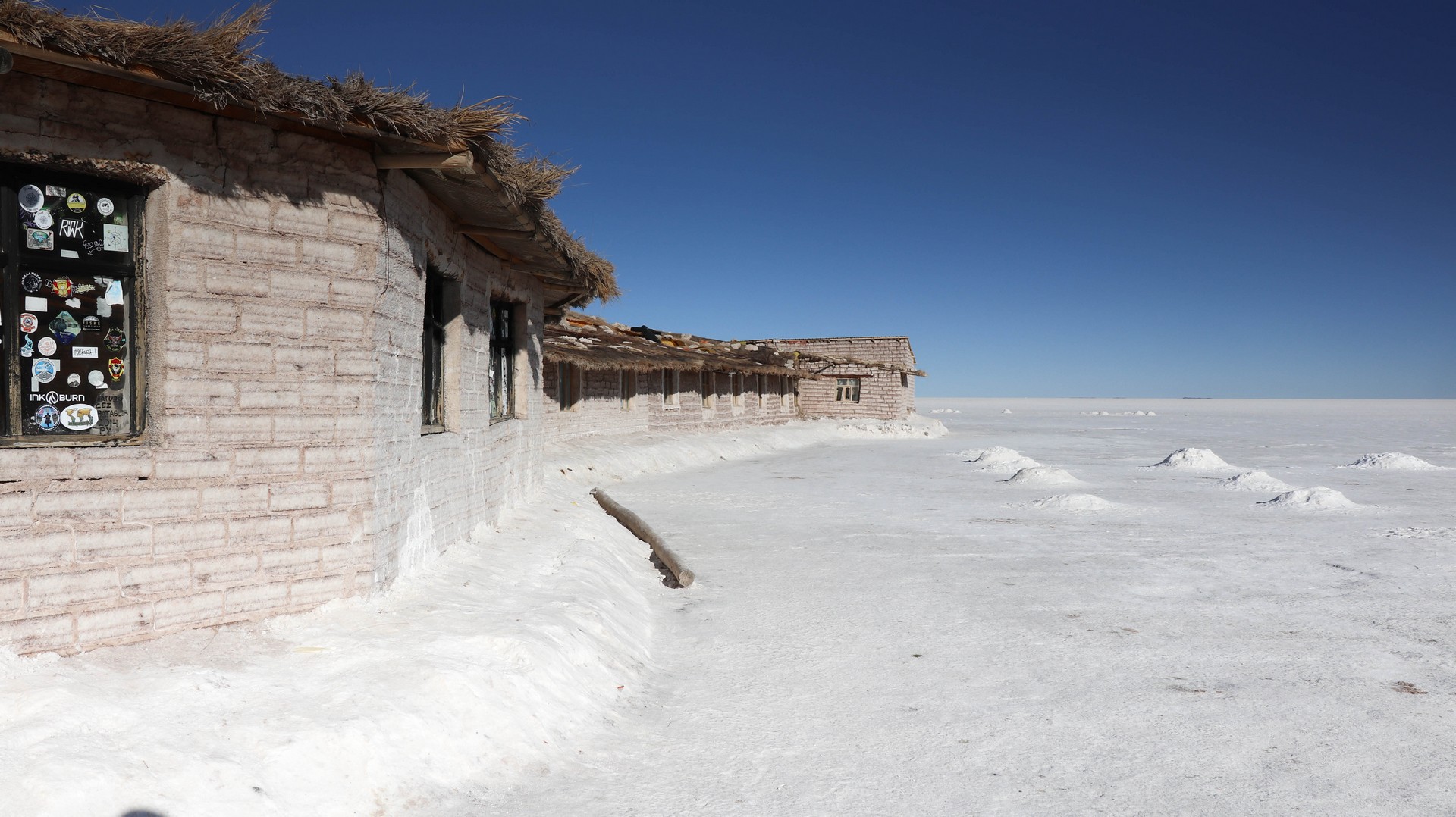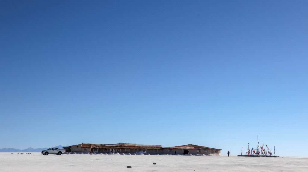 The big wide white is so impressive we decide to not push to the small village but spend one more night on the Salar, in the second salt hotel constructed, next to the famous flag statue.