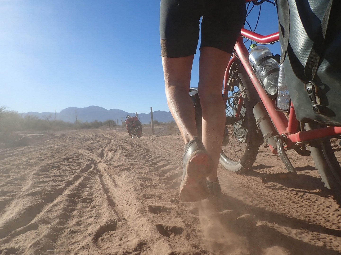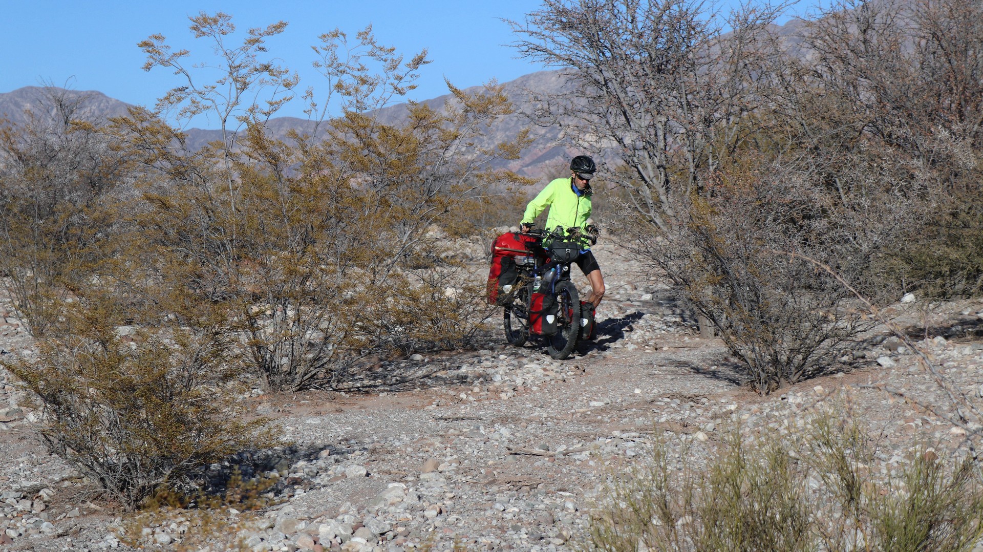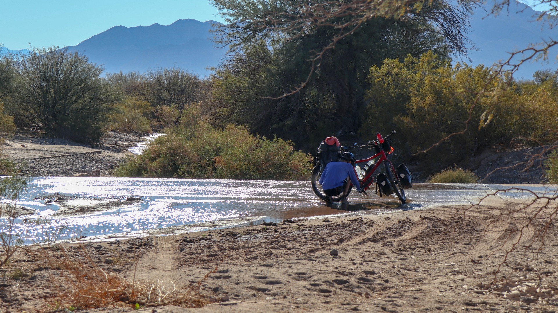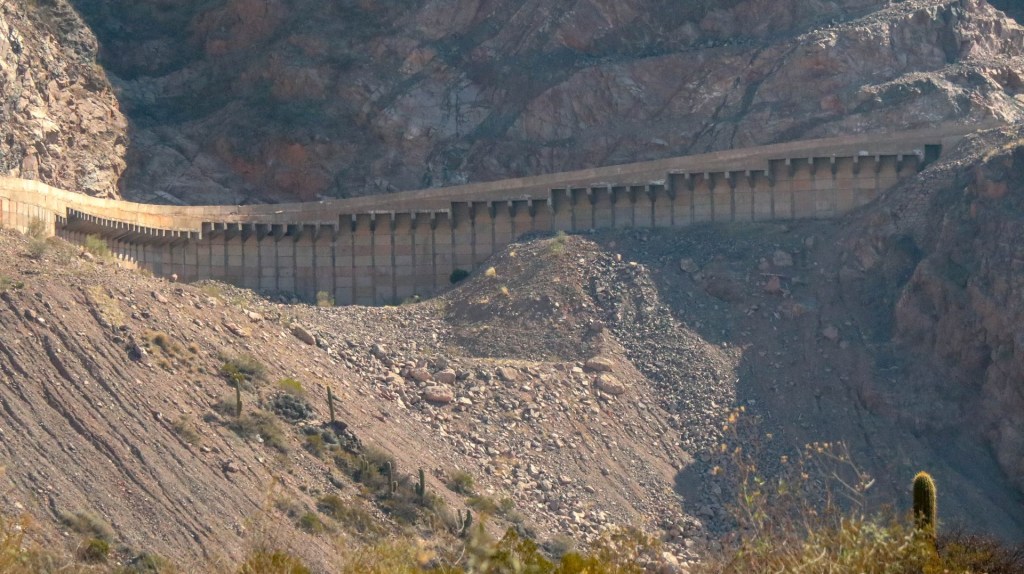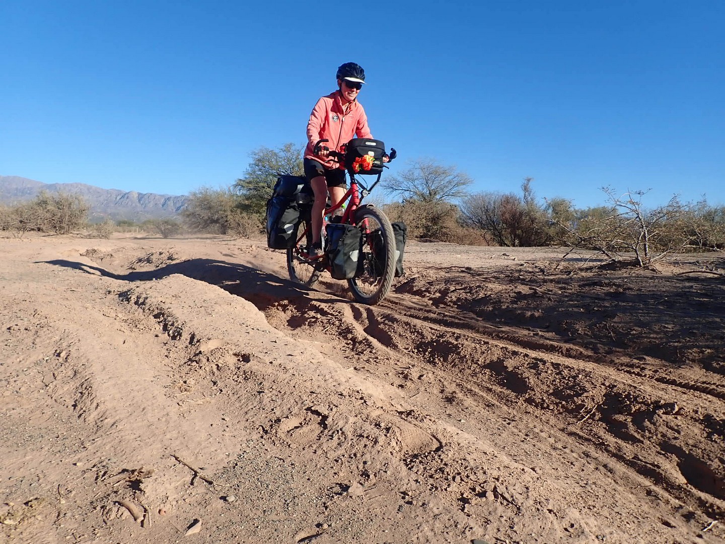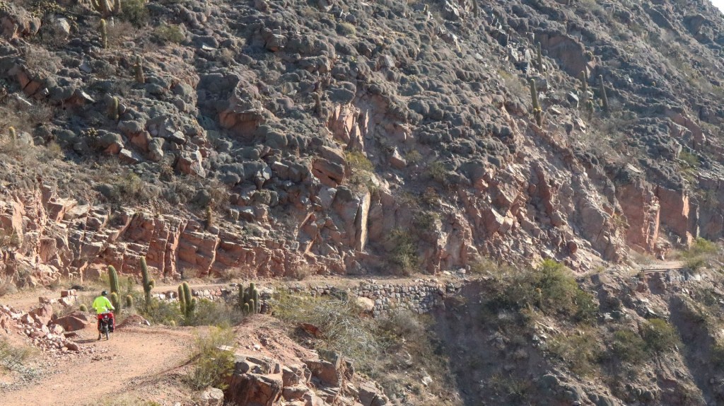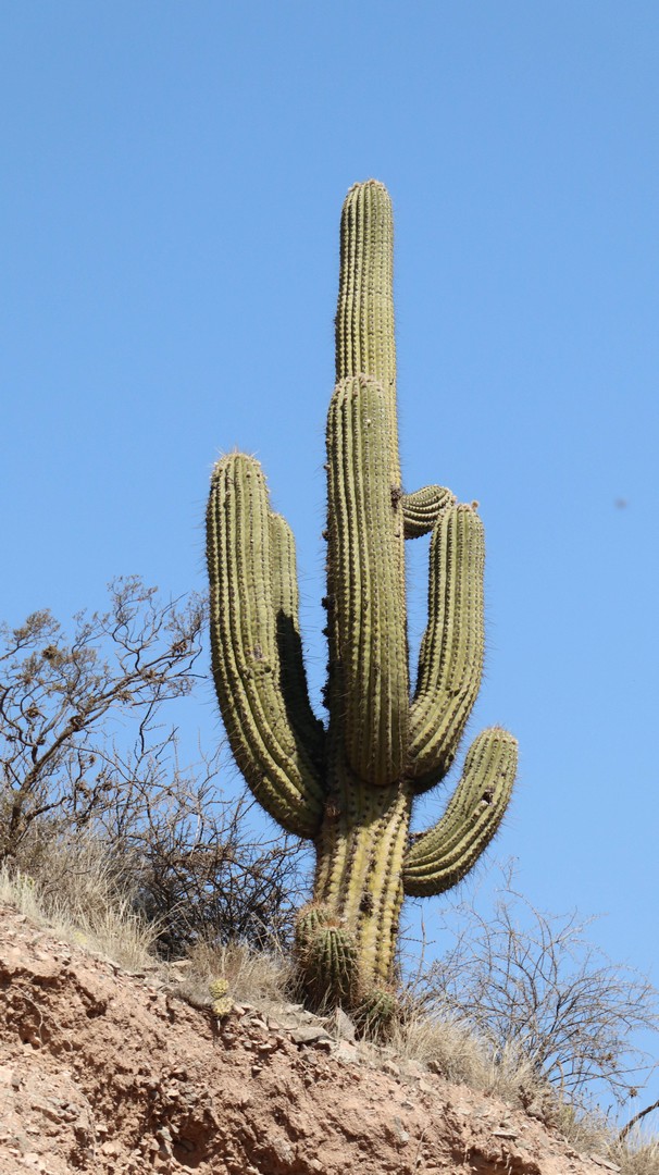 Joining Route 40, passing a police control where hardly anybody is passing. Whole day steadily climbing with calve biting, nasty short down and uphill stretches, to pass the countless number of little rivers that cross the road. Since there is no water most of the year, they do not bother to build bridges, the road descends, you cross the stream and the road goes up. We are biking through the Bermejo Valley and it is bare, except for thorny bushes and few cacti. There is a very strong headwind, called Zona wind and it carries a lot of dust, as it often seems to do. We wear our Buffs over our faces against the dust and take the lead in turns, every 2 and 3 km to create wind shadow for the other. Wondering who does the 3 km? Frank of course, he is feeling much better than when we were biking at +3,000 m.