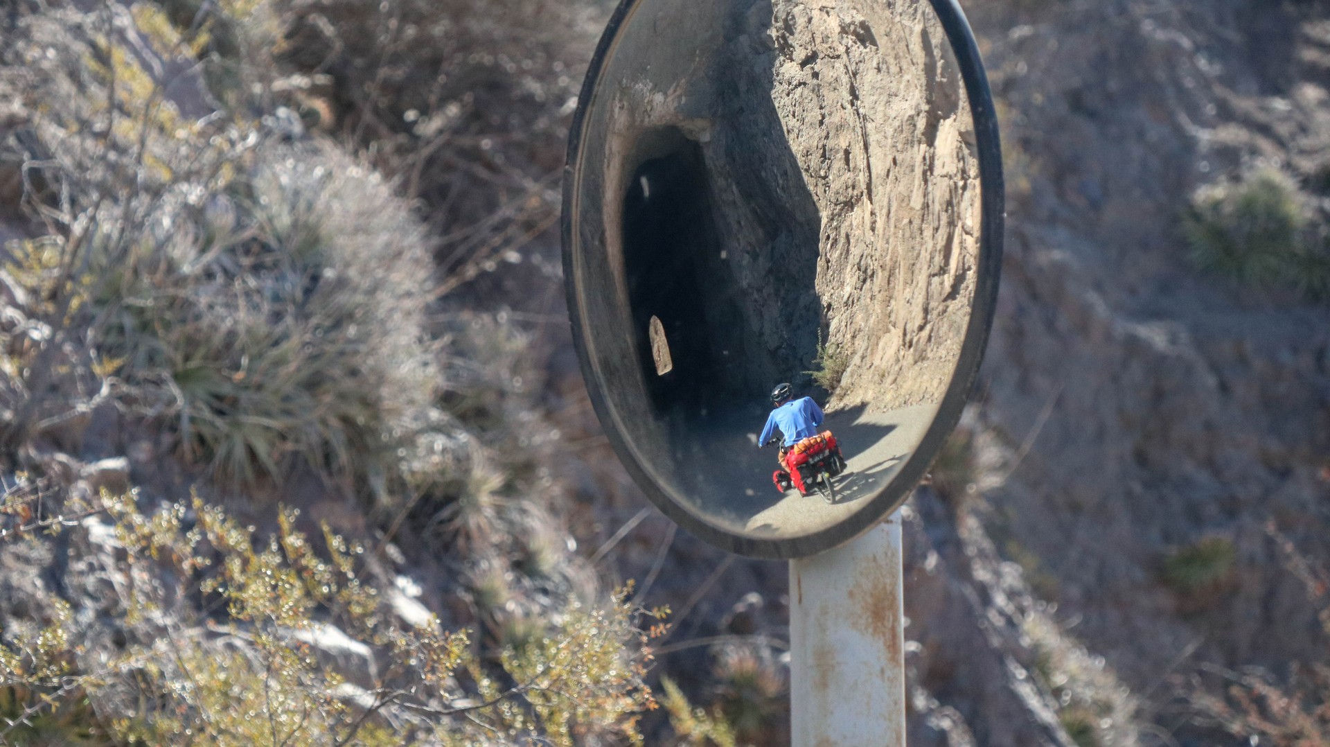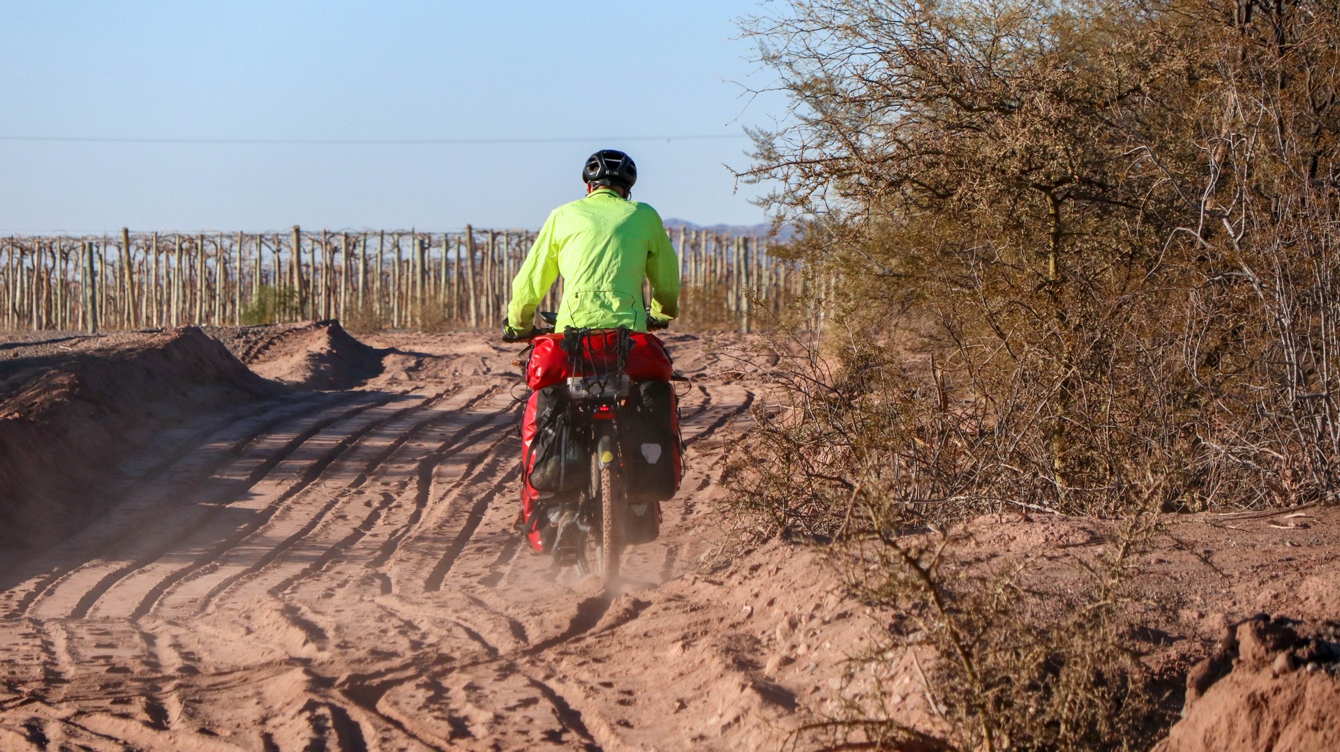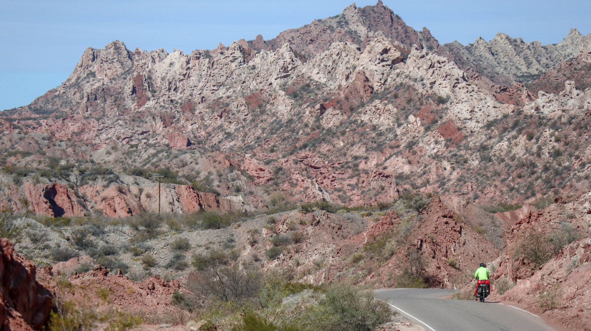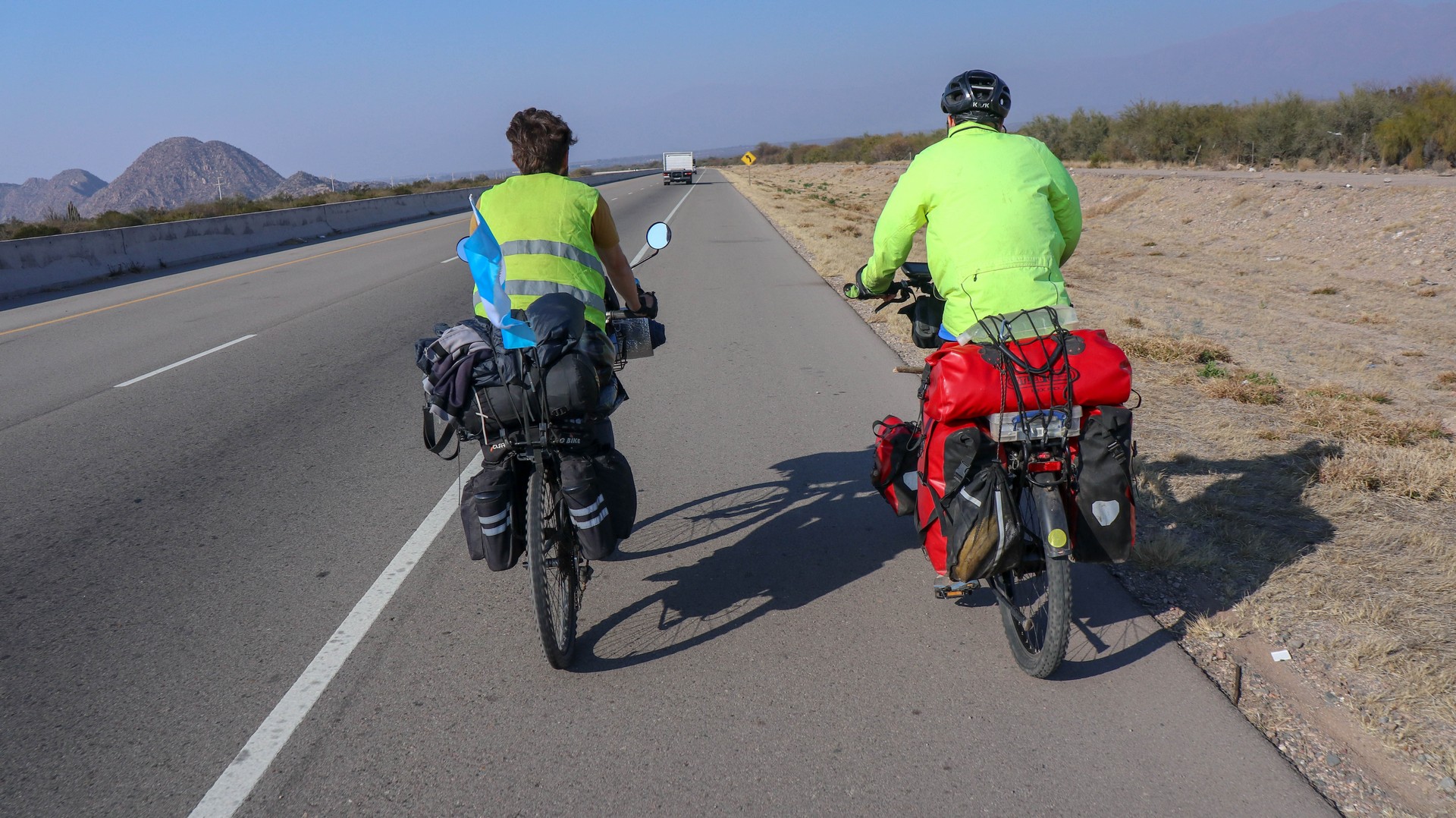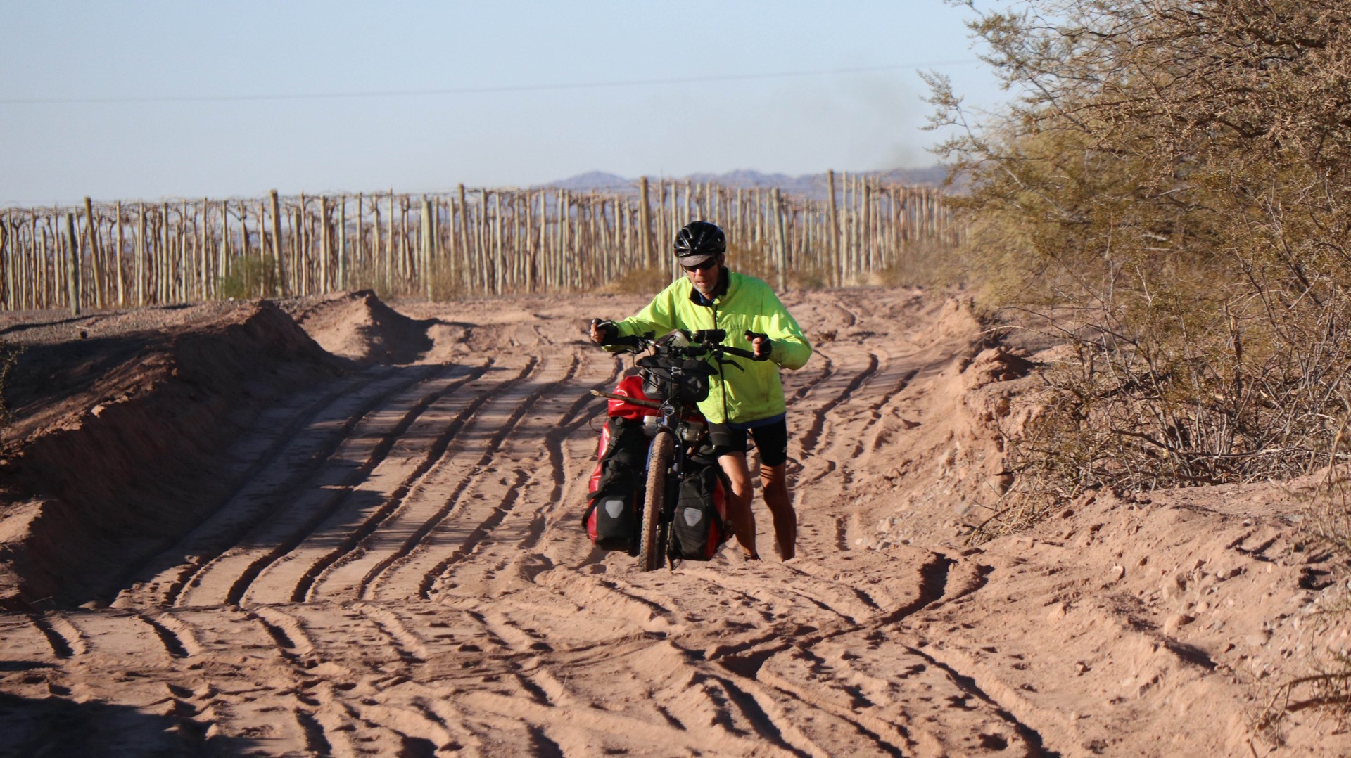 Joining Route 40, passing a police control where hardly anybody is passing. Whole day steadily climbing with calve biting, nasty short down and uphill stretches, to pass the countless number of little rivers that cross the road. Since there is no water most of the year, they do not bother to build bridges, the road descends, you cross the stream and the road goes up. We are biking through the Bermejo Valley and it is bare, except for thorny bushes and few cacti. There is a very strong headwind, called Zona wind and it carries a lot of dust, as it often seems to do. We wear our Buffs over our faces against the dust and take the lead in turns, every 2 and 3 km to create wind shadow for the other. Wondering who does the 3 km? Frank of course, he is feeling much better than when we were biking at +3,000 m.