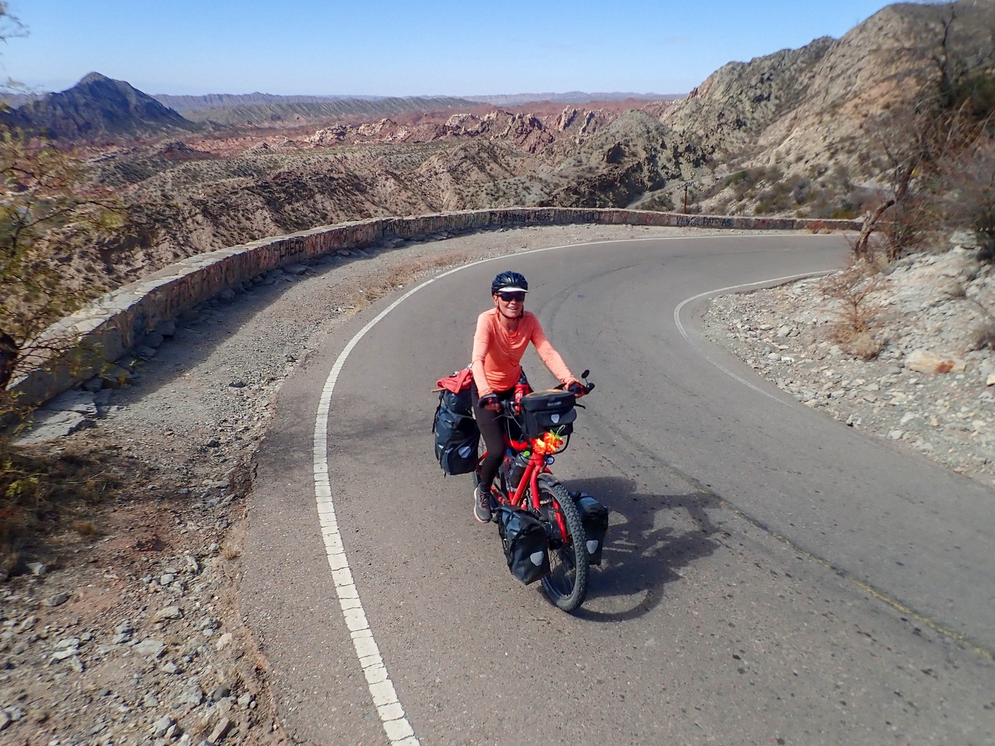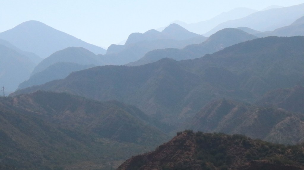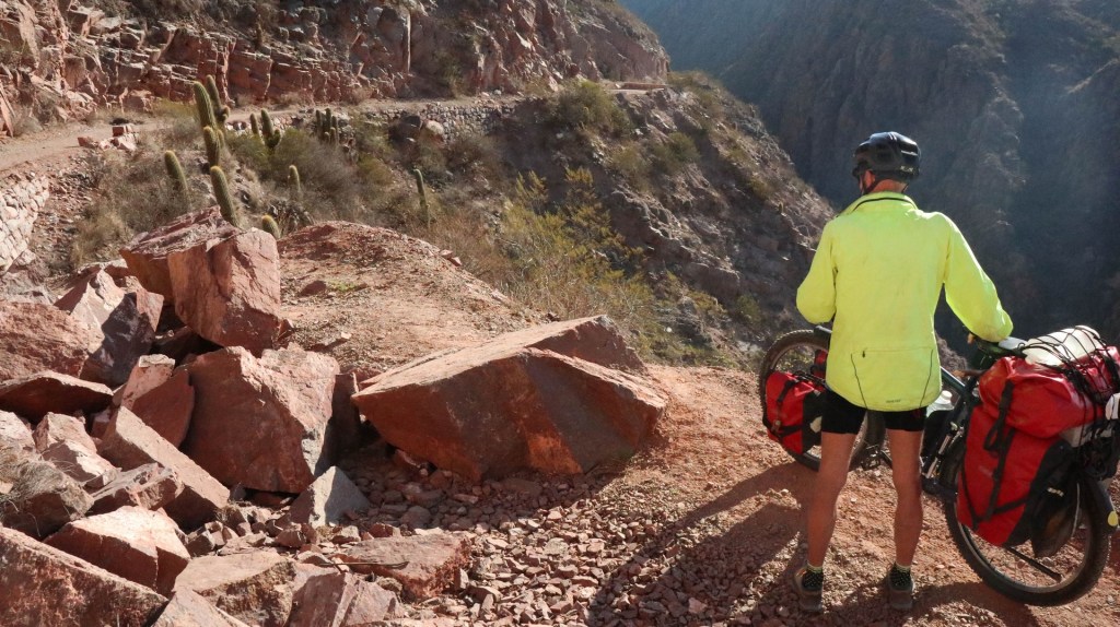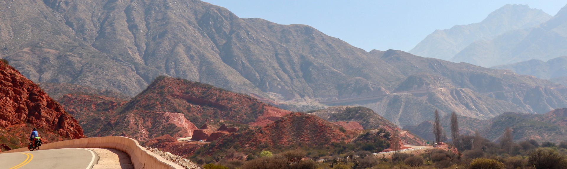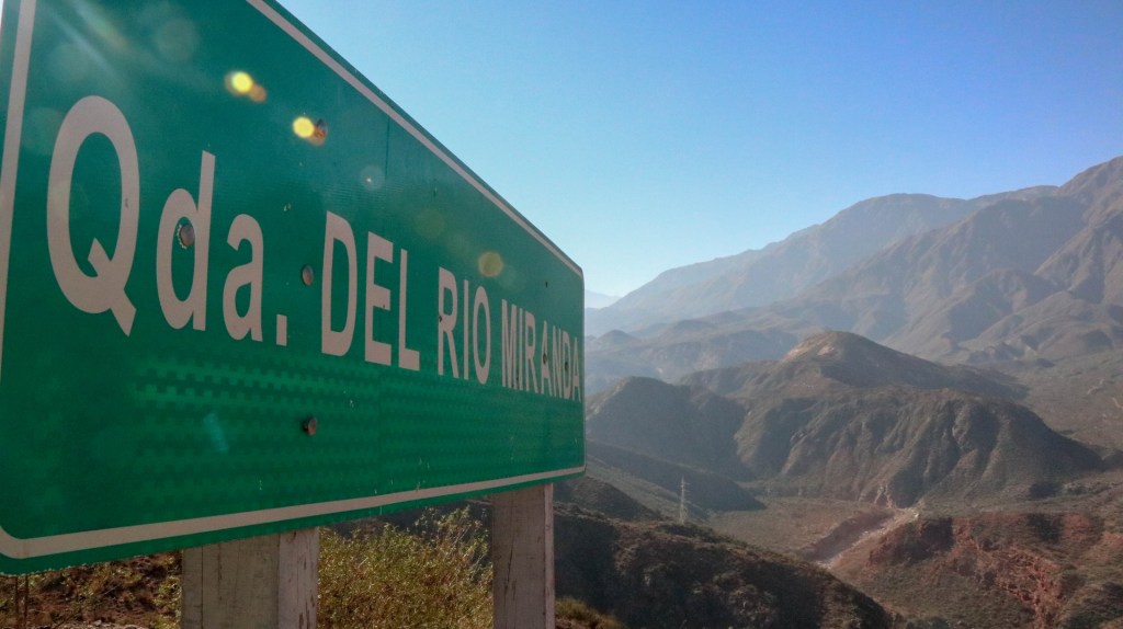 Cross the pass hitchhiking? While it is beautiful weather and the gradient is not more than 4-8%. No way. We continue and will see how far we get, which is less far than expected because our climbing legs have disappeared biking the endless antiplano. We enjoy the beautiful valley created by Rio Miranda. Layered mountains covered in a haze created by microscopic particles which are too light to fall to earth. Particles from exhausts, wood fires and other human activities. Climatologically it is a disaster as the haze absorbs heat and is one of the reasons our earth is getting warmer and warmer. Rio Mirande has created a valley but also a steep canyon and the only road is glued against one of the steep mountain slopes.