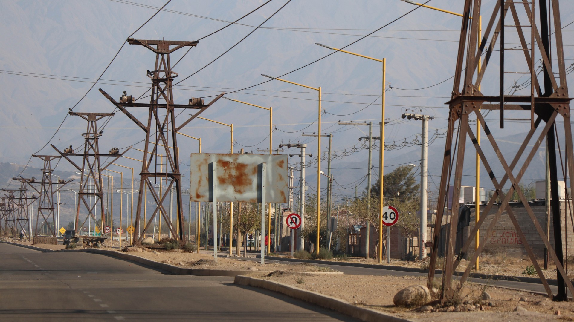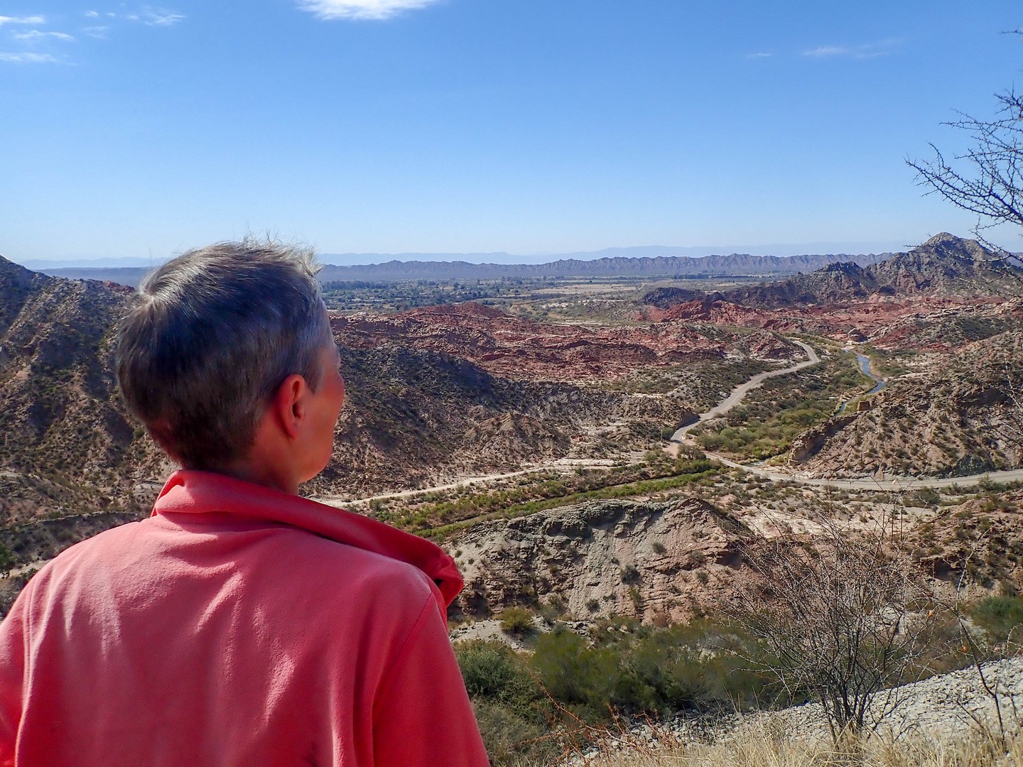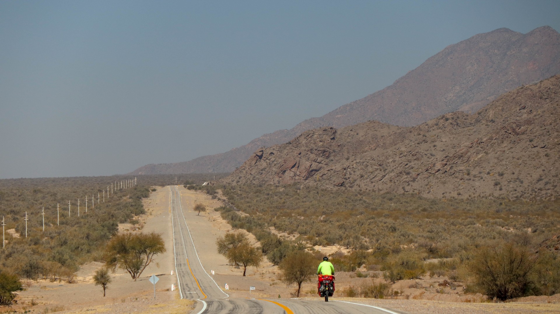 Cross the pass hitchhiking? While it is beautiful weather and the gradient is not more than 4-8%. No way. We continue and will see how far we get, which is less far than expected because our climbing legs have disappeared biking the endless antiplano. We enjoy the beautiful valley created by Rio Miranda. Layered mountains covered in a haze created by microscopic particles which are too light to fall to earth. Particles from exhausts, wood fires and other human activities. Climatologically it is a disaster as the haze absorbs heat and is one of the reasons our earth is getting warmer and warmer. Rio Mirande has created a valley but also a steep canyon and the only road is glued against one of the steep mountain slopes.