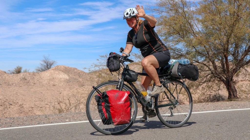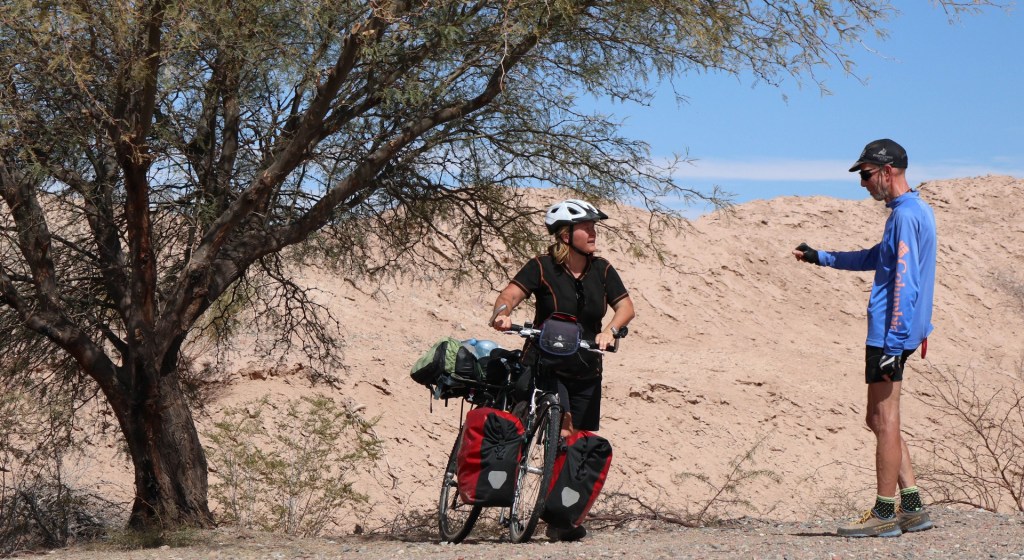 Again we see a biker in the distance and since we have not seen too many we cross the road to say hello. Yvonne from Czech is pleasantly surprised that we spend time talking with her. Seems she only has started in Mendoza a few days earlier. On her own! Did some biking trips before and now quit her job to see if there is something else in life besides work. Way to go girl! 44 and daring to take such decision! Good for you!