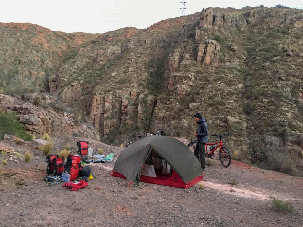 We underestimated the headwind in combination with the climbing and we are slower than expected, so we will have to camp. Not having enough water forces us to ask at a campamento. First we thought campamentos were campgrounds, but here they are guarded storage places for road construction companies. We are lucky the caretaker Walter is willing to share some of the water they store here. Its only 25 km from the next village we could push on but we take the opportunity to camp.