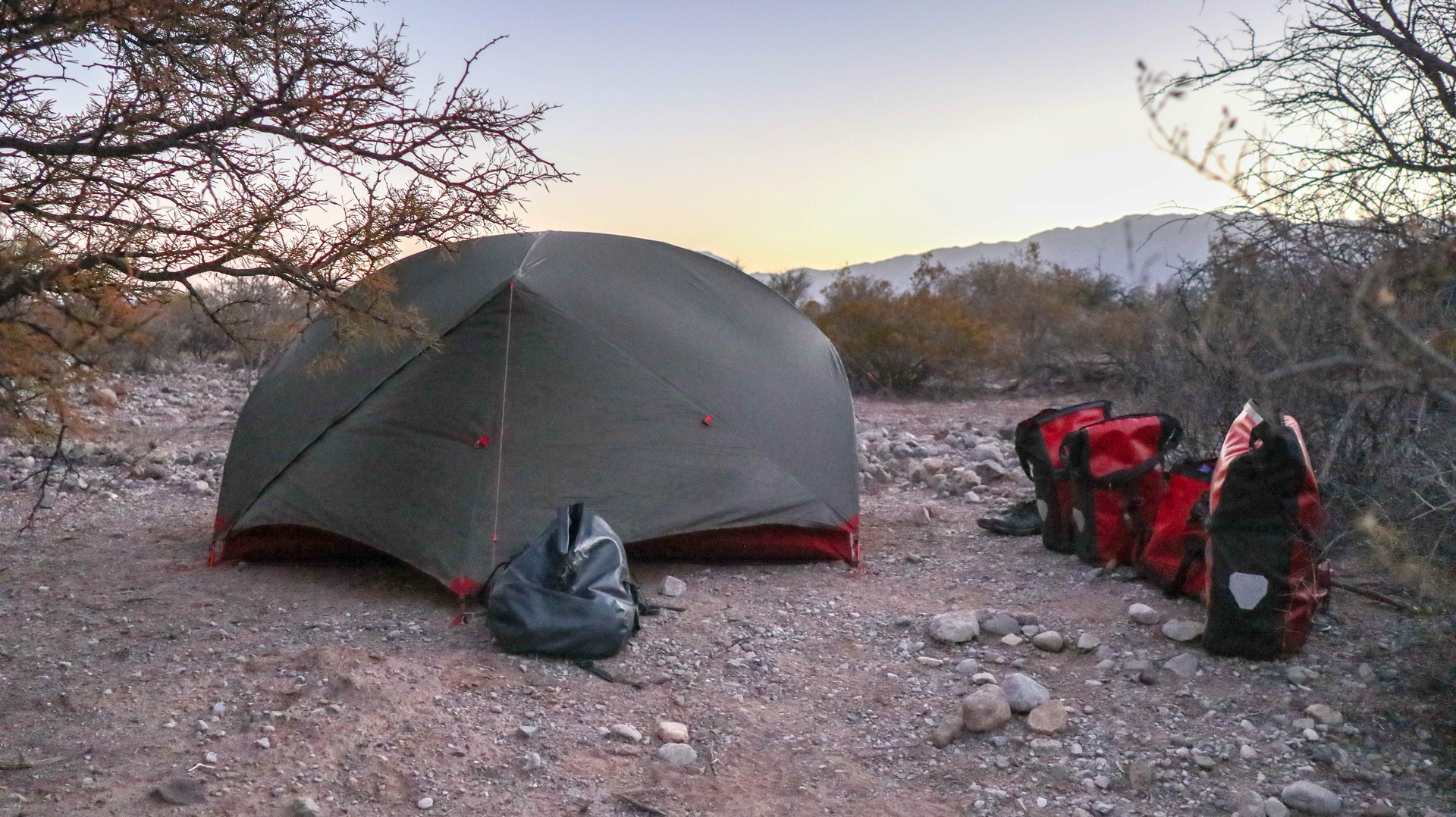 As Frank has been dreaming that the tent was surrounded by water we don’t camp in the shallow riverbed, although it is dry season and very unlikely to rain, but between thorny bushes and cacti on higher ground. Super quiet, so many stars, such a lovely night in the middle of nowhere. We feel super safe. Priceless.
