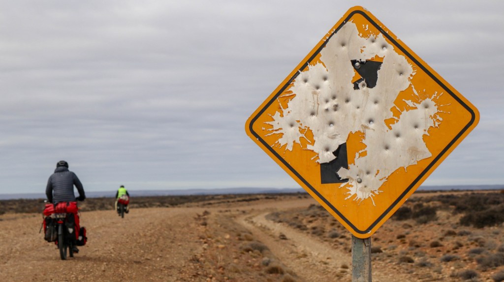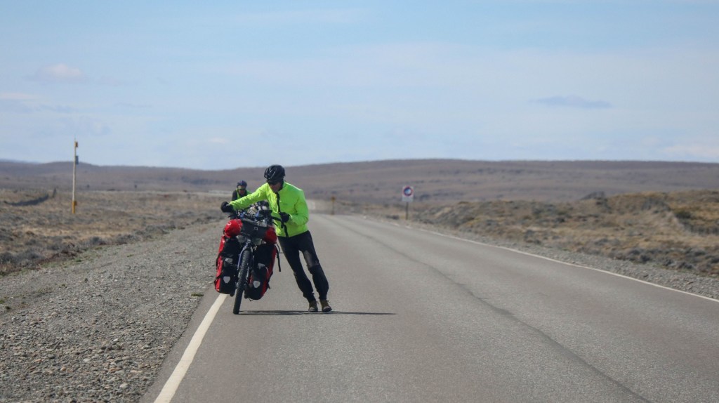 At one moment the roads bents a bit making it already more challenging. Followed by a T crossing where we have to go right. The force is against us now! As we are almost swept to the middle of the road, as the wind comes in gusts so no prediction on how hard to steer against the wind, we decide to push the bikes. During the next 25 kilometers we try to bike but not hearing anything but the deafening wind, combined with being swept to the middle of the road is not a wise combination. More pushing than biking. 4 hours did it take us to cover the next 20 km to a road stop offering the first shelter we encounter.