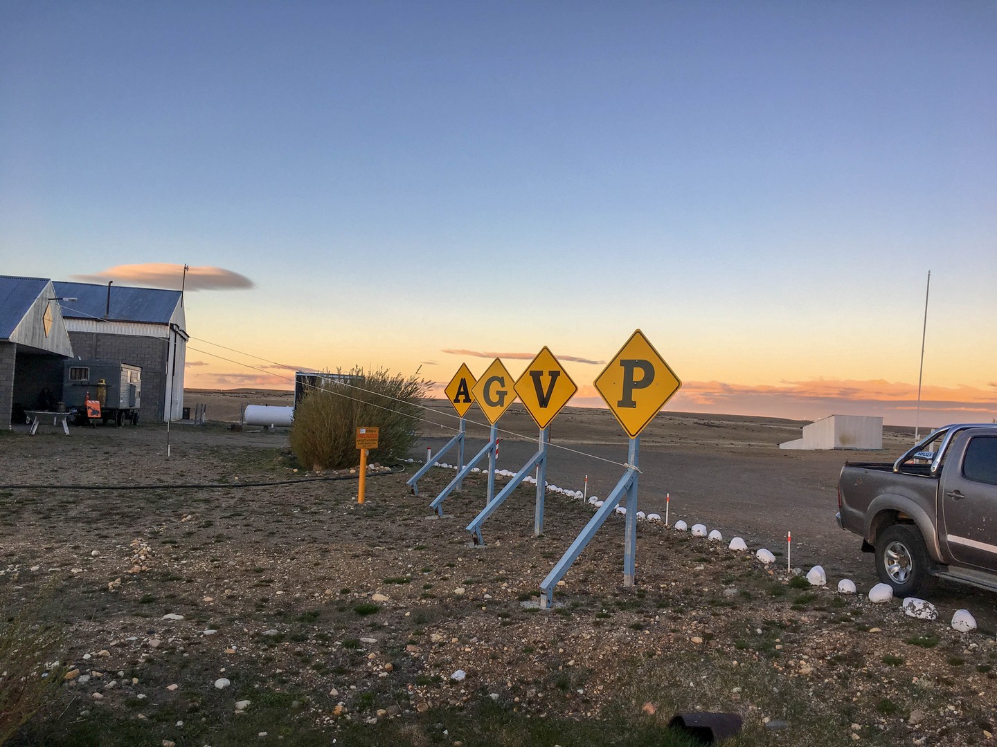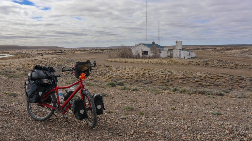 Beautiful asphalt with an encounter of other cyclists just starting their adventure in combination with little traffic brings us to the intersection where we will turn right tomorrow. As there is still a strong wind we ask with AGVP (Administración General de Vialidad Provincial = provicial road administration) to shelter at their place. We can set-up the tent behind or in front of the building. Roel takes the one in front of the building as it also offers shelter against rain, but the remaining space is too small so we go behind the big barn. When I ask where the toilets are the caretaker points to the field. At least he lets us shelter.