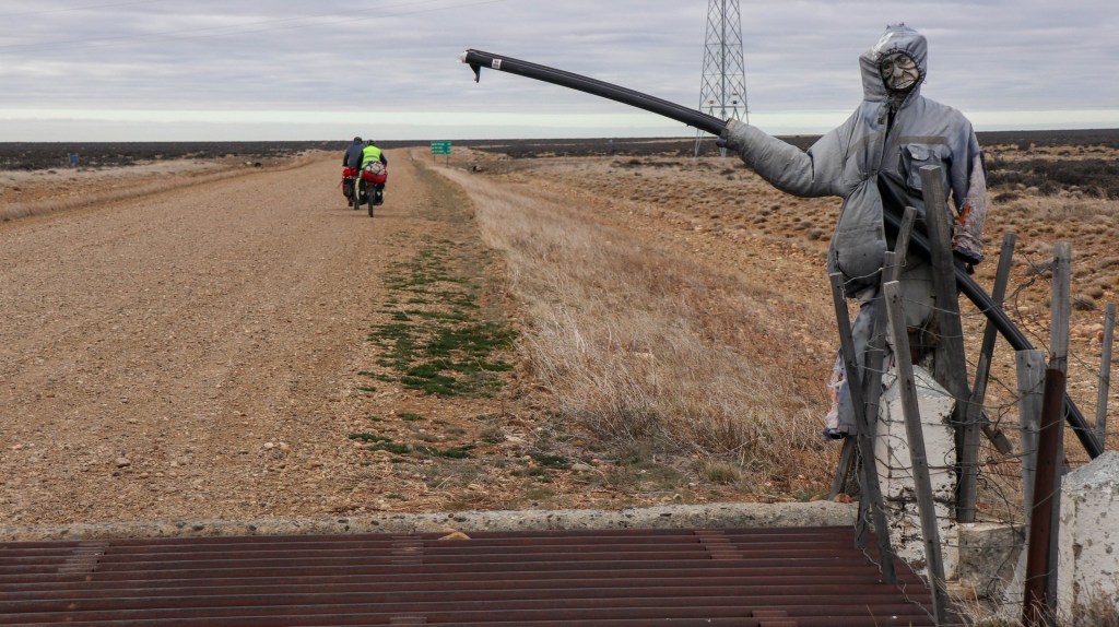 We wonder to sleep at a gravel pit before the junction with the asphalt road but as we are running low on water we decide to continue to the next AGVP location. Just before that we meet Kyla, just started from Ushuaia, biking North. She asks if she could join us, where-ever we would spend the night. She is still trying things out as it is the first time for her on a road trip and being on her own. I totally understand that she did not want to stay on her own at the road workers place.